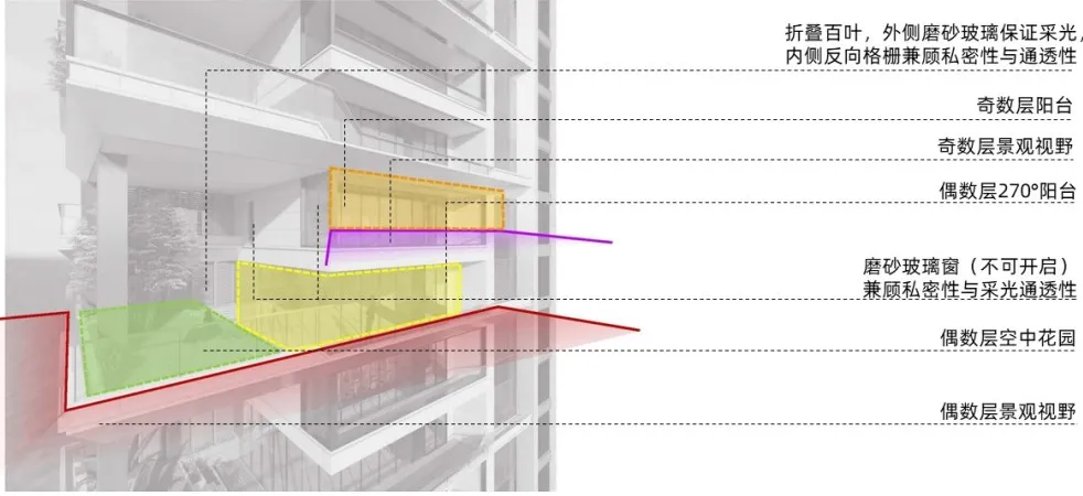 再比如岳阳金茂·云府奇偶数层采用不同视野,保证空中花园私密性及各层采光充分性。