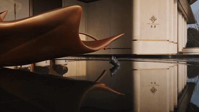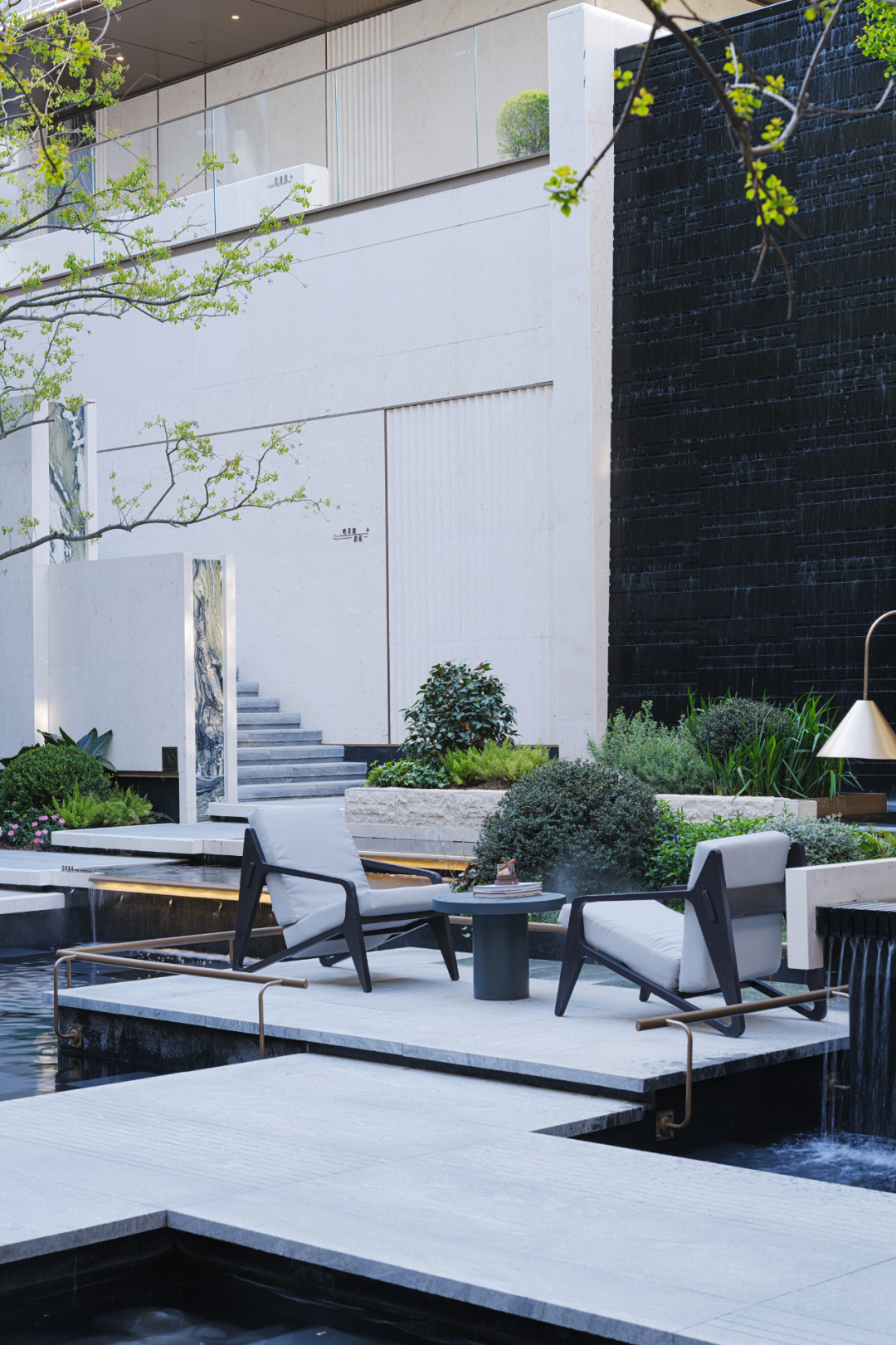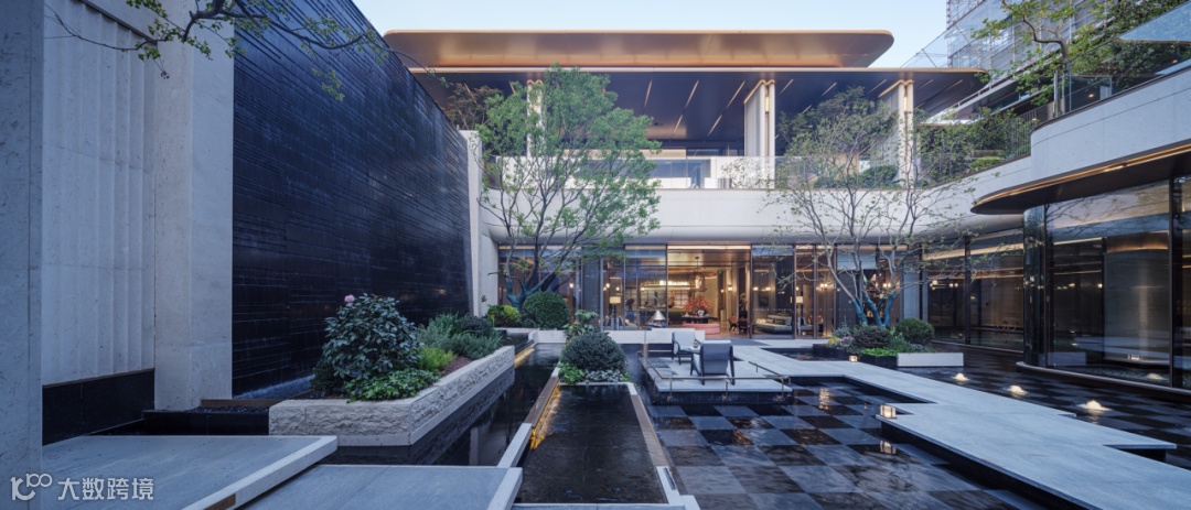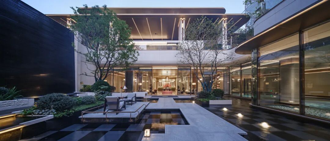 400㎡的水域面积构成了极具价值感的水院空间。池底采用安哥拉黑与黑金沙石材混铺,呈现出深邃稳重的视觉效果。远处望去,建筑仿佛漂浮于水面之上,带来庄重而宁静的空间体验。