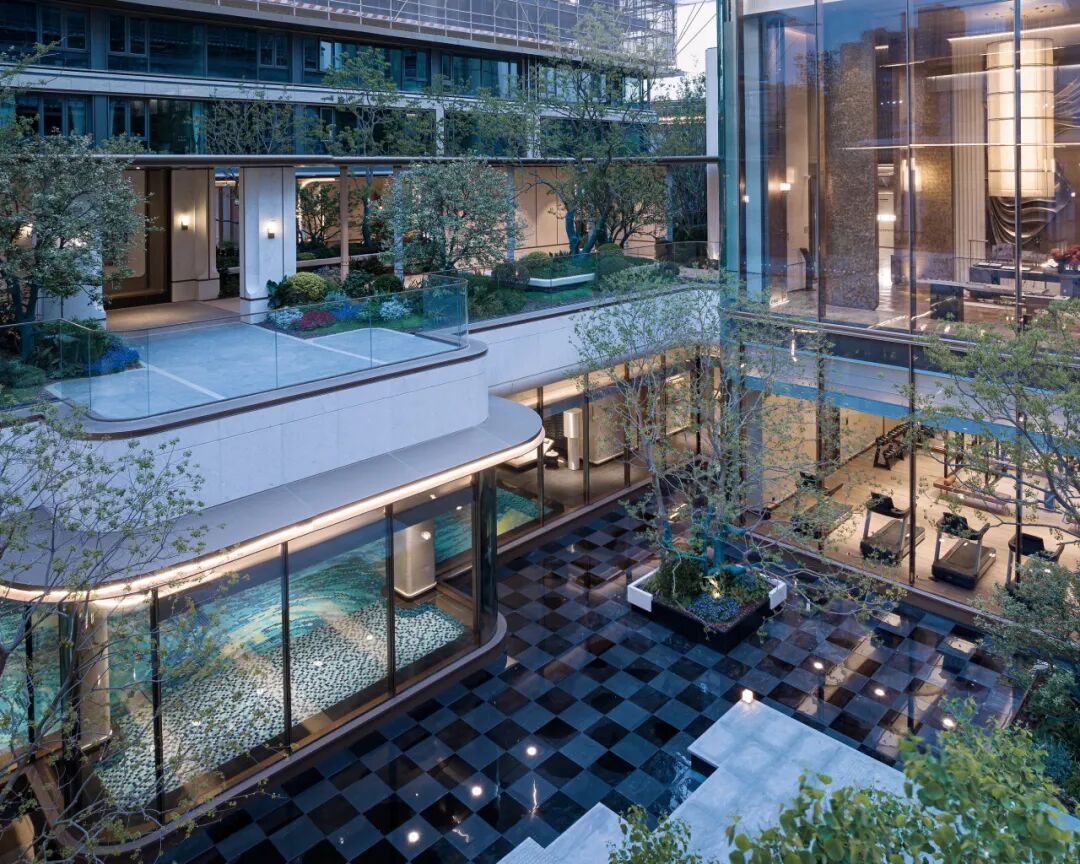 北侧架空层通过花池水景与植物交错布局,打造“无界生活”场景。光线自由穿梭,风景渗透至室内,营造开放而不失私密的生活氛围。同时规划多个互动空间,构建充满东方意境的花园庭院。