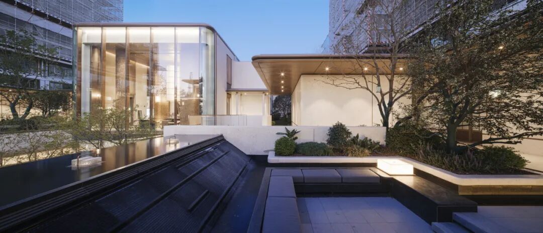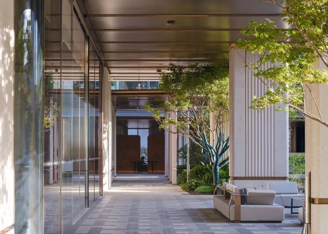 值得一提的是接待大堂的设计。高达9米的挑空空间俯瞰下沉庭院,构建归家动线中的仪式高潮。延续主入口的设计语汇,屋檐与墙角采用圆弧倒角处理,搭配片状柱式结构,延续海派摩登风格的优雅基因。