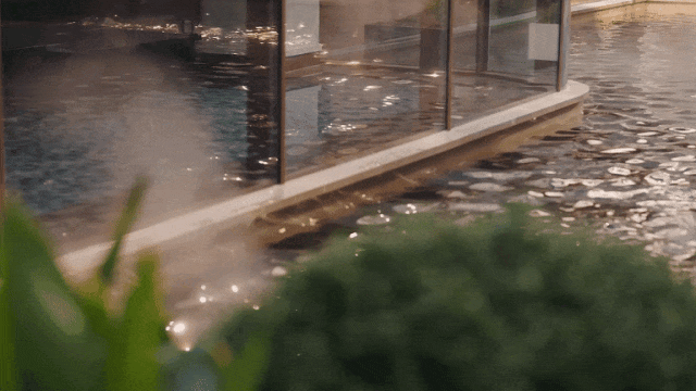 通过花池与水景的体块穿插,巧妙化解6米高差,展现几何之美。高达6.5米的双跌水叠瀑,打破地上下界限,带来震撼尺度与多维情绪化体验。溯源合肥"千湖之城"生态肌理,将自然水韵转化为当代度假美学。整座会所亦仿佛漂浮于水面之上,尽显隐世之感。
