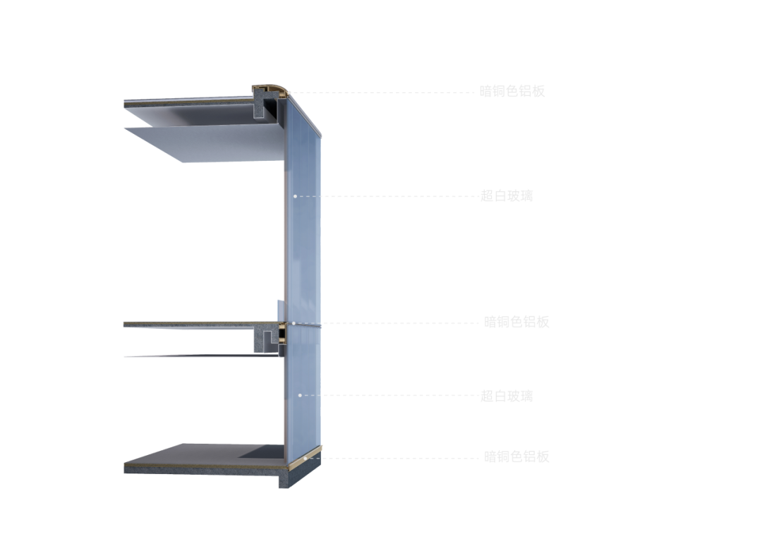 立面主体采用超白玻璃,吊顶选用暗铜色铝板,并通过对金属线框的极致消隐工艺,打造出奢雅而不张扬的艺术氛围。底座墙体以月光米白石材勾勒圆弧线脚,在消隐的金属线框之间淬炼出一种兼具现代格调与文化厚度的空间诗。