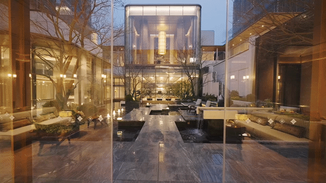 在示范区的材料选择上,月光米黄奢石、暗铜色金属铝板与大面积超白玻璃构成淡雅浅黄色系,肌理如桂花般沁晕,营造出别具东方韵味的审美意境,将工艺与美学融合于近人尺度之中。而中庭花园和大量使用超白玻璃,成功将阳光引入地下空间,打破传统地下室的封闭压抑,使其更加明亮开阔。