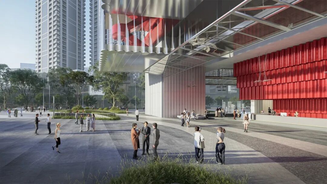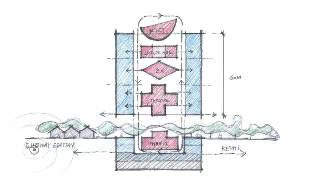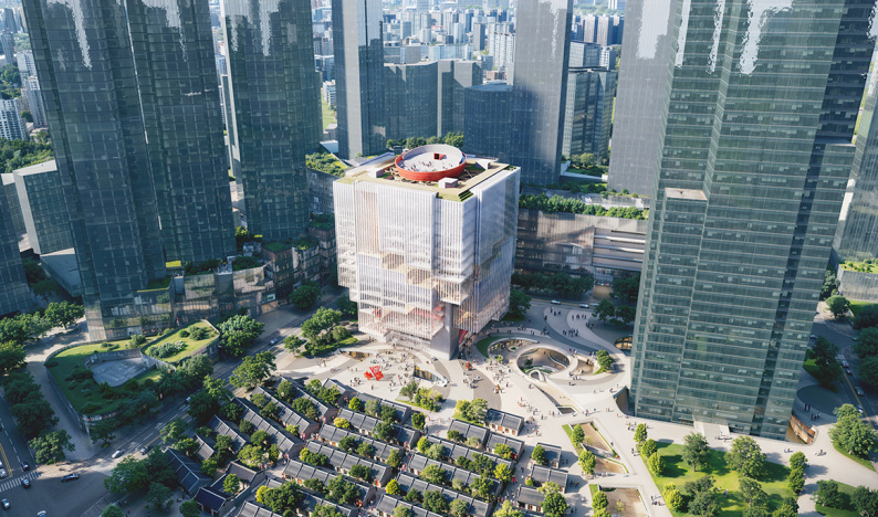 将与罗湖区文化馆一同站上历史舞台的还有场地东侧的湖贝塔,设计师考虑到分期建设时序和湖贝文化焦点的标识性,认为文化馆不宜与湖贝塔贴临设计;而过高的建筑体量也会对北侧的商业界面形成遮挡与压迫,所以,设计师把高空交给超塔,地面还于公园。