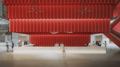 两者的用地面积接近,而建筑面积几乎相差一倍,因此在形体逻辑上美术馆是水平延展的,而文化馆是垂直向上的。但AUBE欧博设计对城市公园的态度是一致而坚定的。美术馆将公园基面抬升至二层,并利用立体漫游系统与室内空间高度渗透互联;文化馆则将剧场抬升,通过架空大堂将历史街区公园引入建筑并使得地面空间与周边全打通。