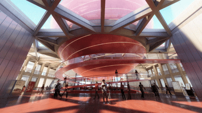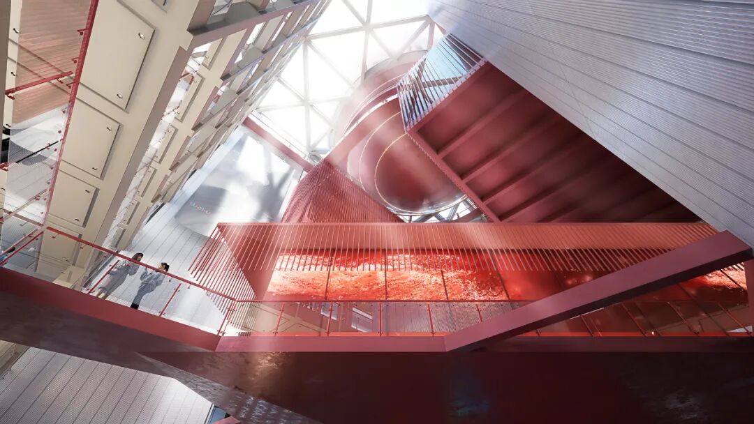 由湖贝站绕村而至的地下步行商业街在建筑东南形成放大的地下公共空间节点,外环建筑体量便由东南角而发,形成逐级而上的室内天阶。整体的建筑功能也由天阶空间的切割自然划分成文化馆与主题文化中心两部分。天阶在不同界面的不同标高预留与商业的连桥可能性,最终形成贯穿上下,渗透内外,并链接四界的公共漫游空间系统。
