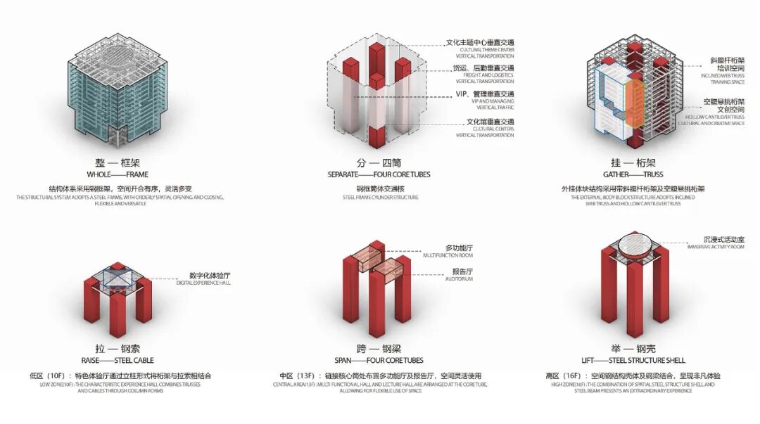 方案之初,设计师首先确立了一个离地16m,边长60m的悬浮立方体,并采用四个核心筒支撑。筒与筒之间通过桁架系统联系起来,内撑外挂。也将建筑空间切割为外环与内核两个部分。方案将定制化的大空间置于内核空腔,形成垂直渗透的共享文化聚落。外环则悬挂于核心筒外侧,采用12m的模数划分成100㎡的单元模块,模块间可分可合,解决了建筑大部分标准功能的采光需求,为日后建筑功能指标的更动提供了弹性。