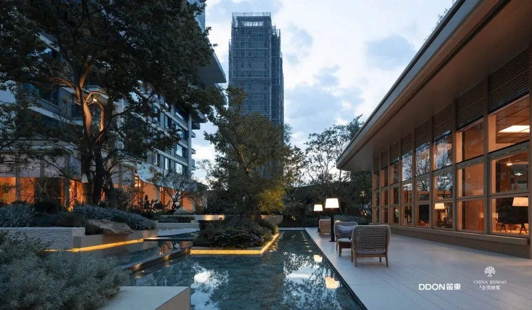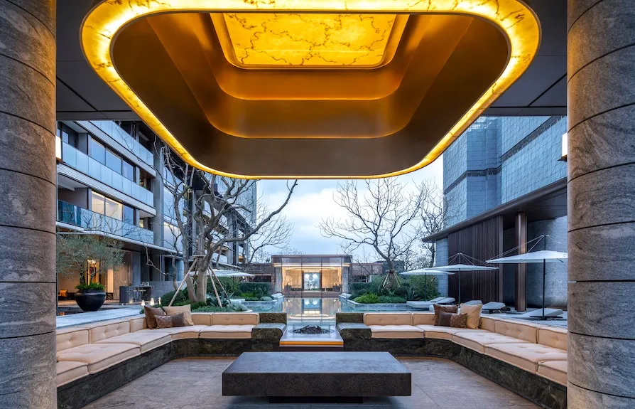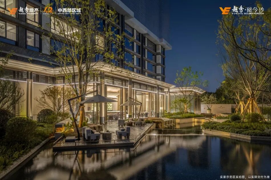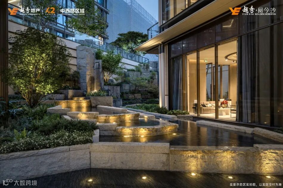下沉式庭院,巧妙运用层级叠水景观,尽显精致奢华与优雅气质,营造出鲜明的空间领域感。