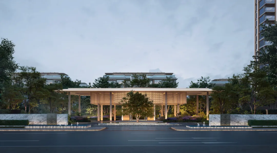 项目延续了重奢和艺术的设计语言,对标安达仕酒店对称式设计美感,定制了长达75米的超级社区大门。6.5米高的超级界面,搭配「锦纶华盖」艺术天幕、「玉踏锦宸」十级琼阶、「金玉满堂」景墙,让门庭交织文化与礼序,赋予入口恢弘的气势。