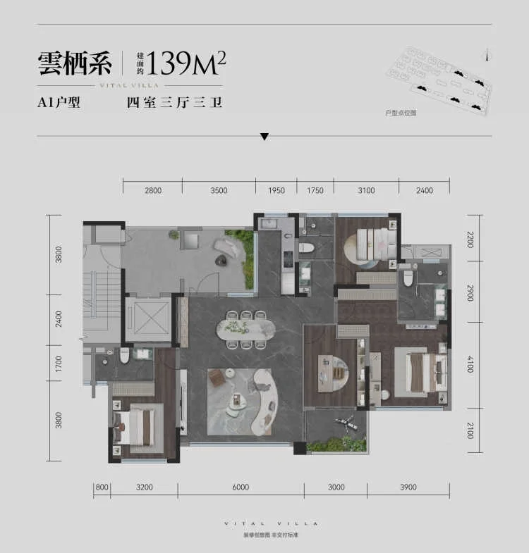 成都邦泰·悦九章约143㎡户型,做到了套四双套房三卫,惊喜的是层高约3.3米。