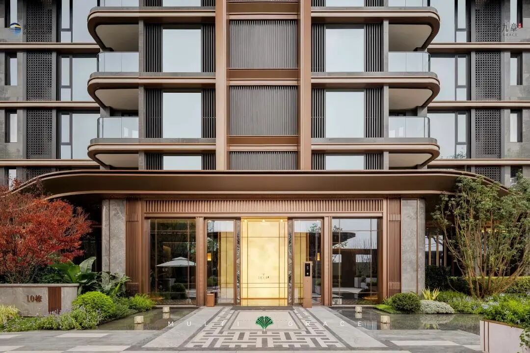 外立面采用现代风格打造。灵感汲取于古风雅韵融合现代美学。外立面取瘦金风骨,以宋冠翅帽檐+玉带铝板雨棚+全景落地窗建东方美学,打造横向韵律、直角线构的隐奢极简艺术。