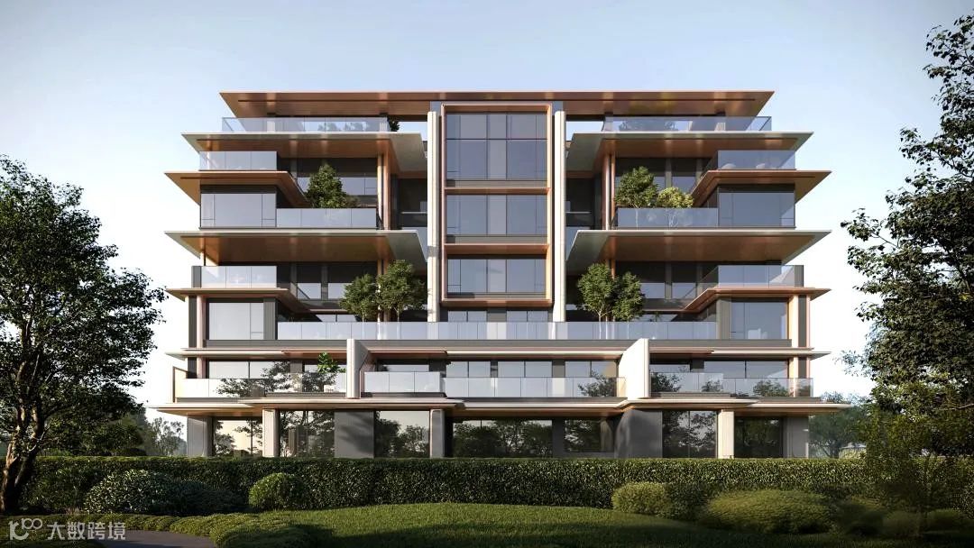 洋房建筑立面延续了“弧形倒角+类幕墙”的设计语言,将三圣乡万亩景观装进360度的环幕大屏中。