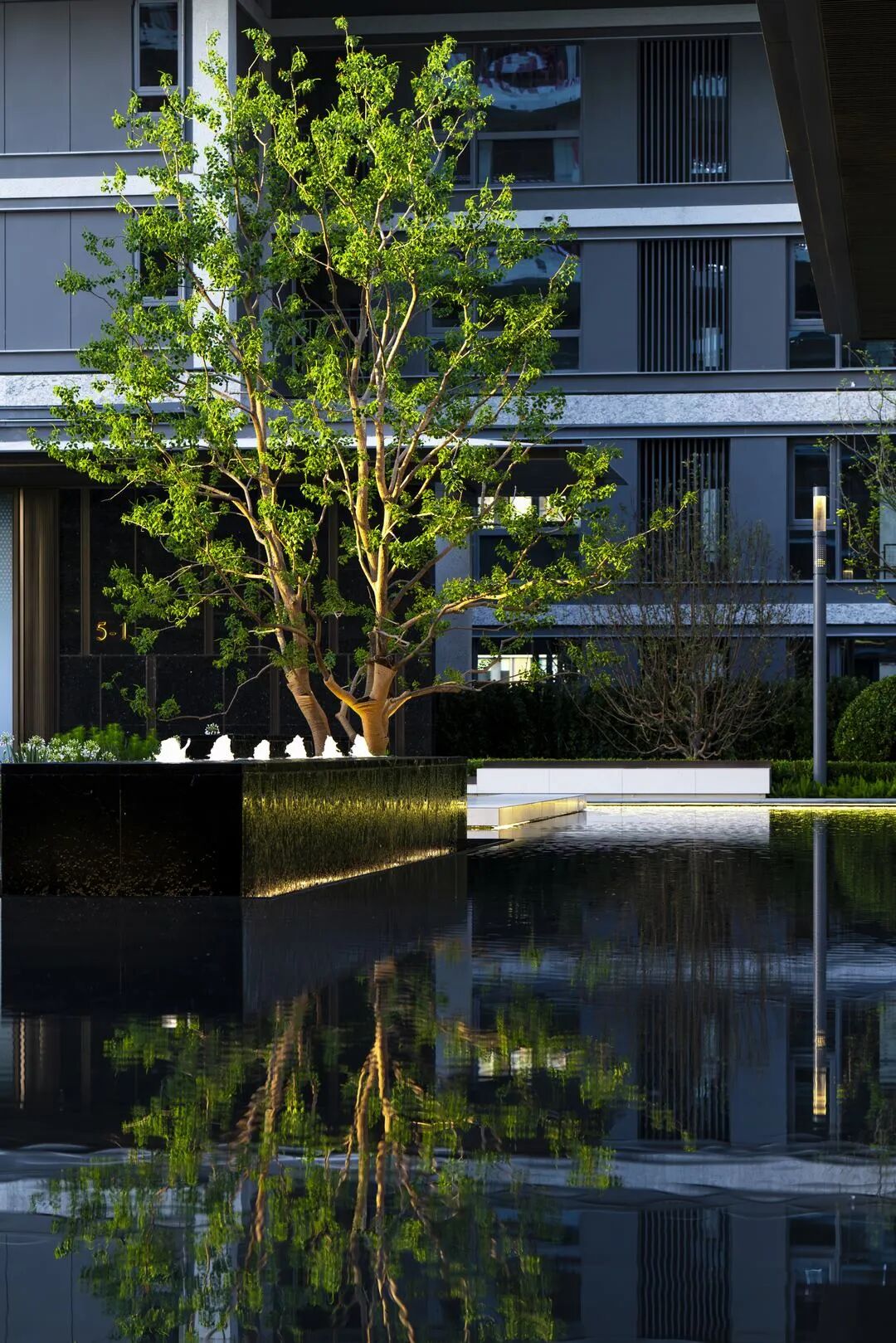 移步下沉庭院,叠瀑水景如脉络般串联起山、台、石、林、池,宛然一幅立体的水墨盆景跃然眼前。