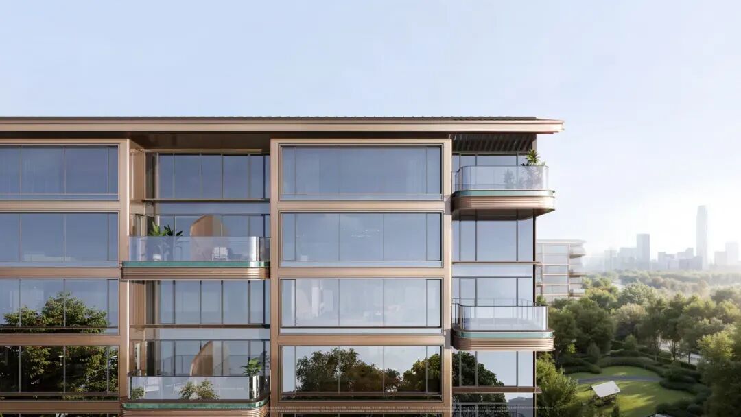 帝王以金昭礼序,以璞彰权柄;建筑取青铜古韵,琢玉显尊贵。金茂璞逸云湖以「金镶玉带」的立面叙事串联中原文明千年脉络,建筑立面取色青铜鼎的斑驳古金,露台玻璃下方镶嵌绿石玉带,重现东方文明中“金玉相生”的珍贵意象。
