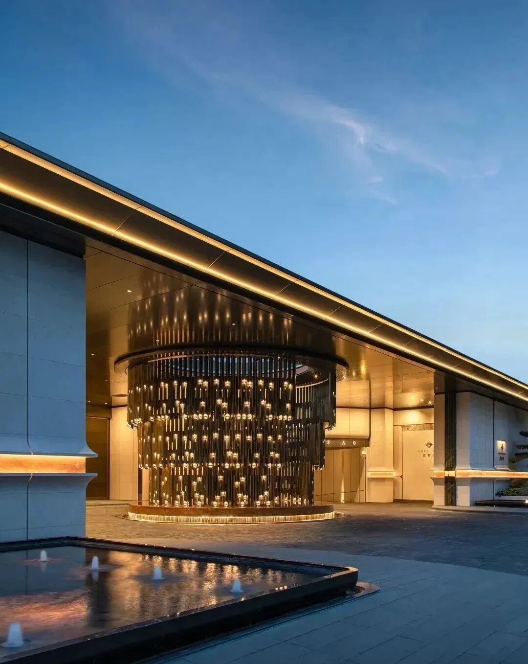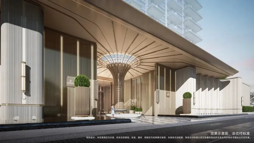 建筑立面以龙山黑陶器型曲线,结合现代建筑风格,打造顶部精致塔冠、微弧倒角设计,形成强烈视觉符号;以沉香米黄主色调,搭配香槟金铝板,呈现精致典雅的美学风格,致敬中原文明。