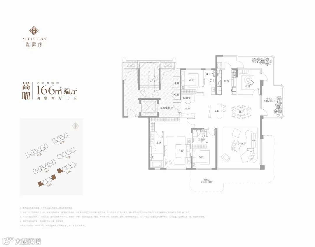 嵩雲序一共六栋住宅,三栋高层三栋洋房。户户赠送立体绿化阳台,主力户型涵盖136㎡高层及166㎡洋房,通过优化空间设计实现105%-115%的超高得房率。