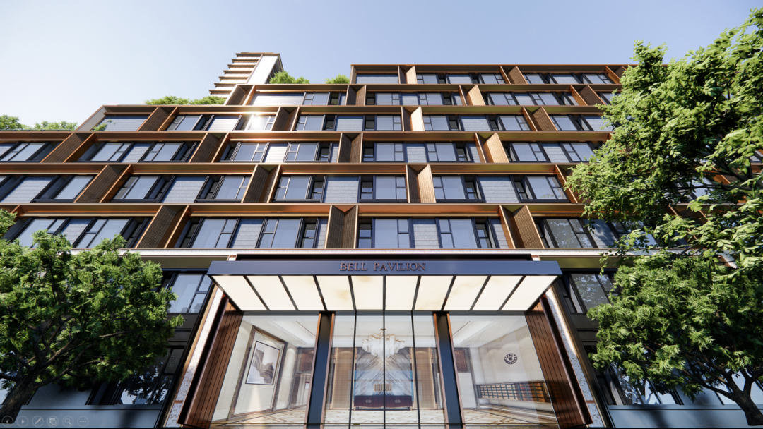 在设计上萃取符合铃铛阁传统建筑中的【塔式建筑】作为灵感来源。提取古代塔身的重叠序列作为标志性设计语言,将传统建筑的形制以抽象的方式融入现代住宅设计当中。