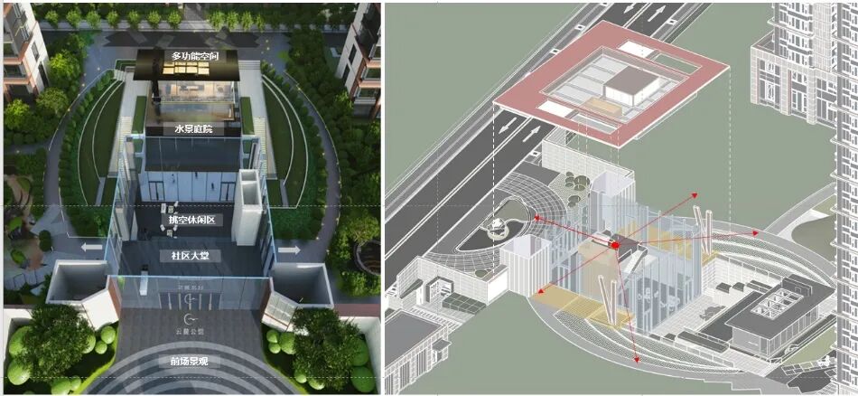 南北地块各自围合成两个生活核心,通过社区大堂连接,形成中央礼仪轴线全区域景观彼此呼应。同时以柔性功能及景观围合界面,有助于实现从区域到社区、从动态向静态的过渡。