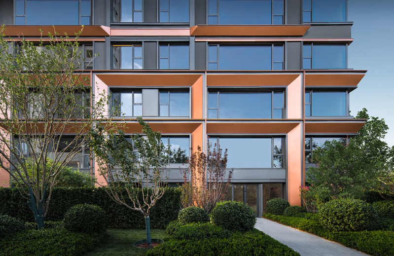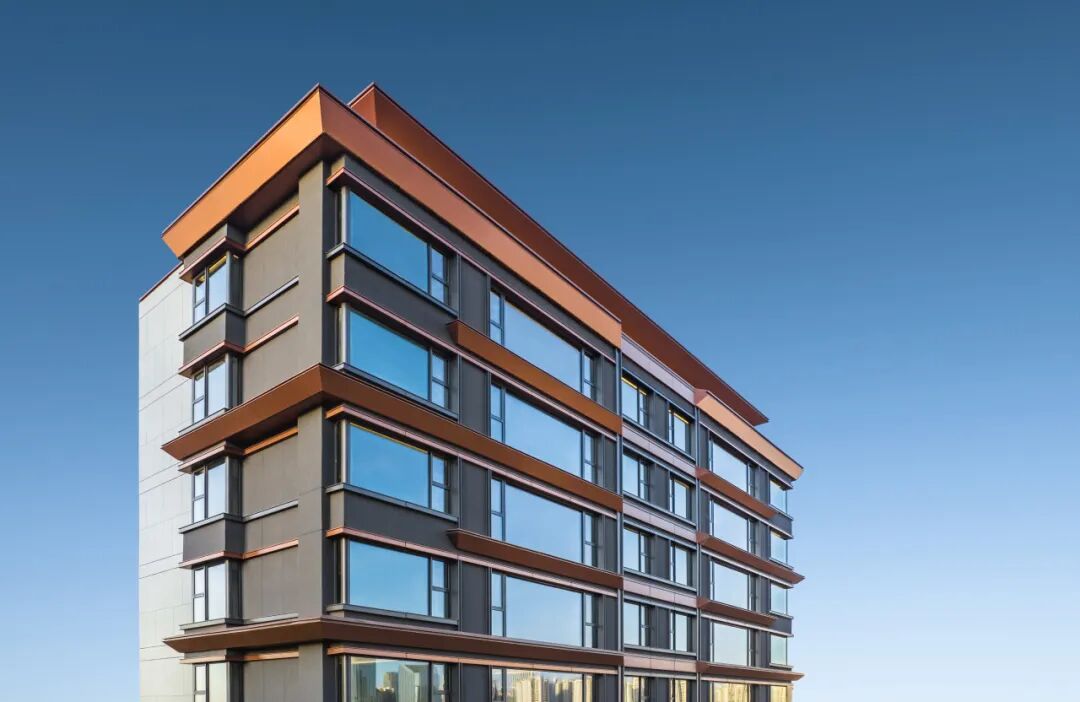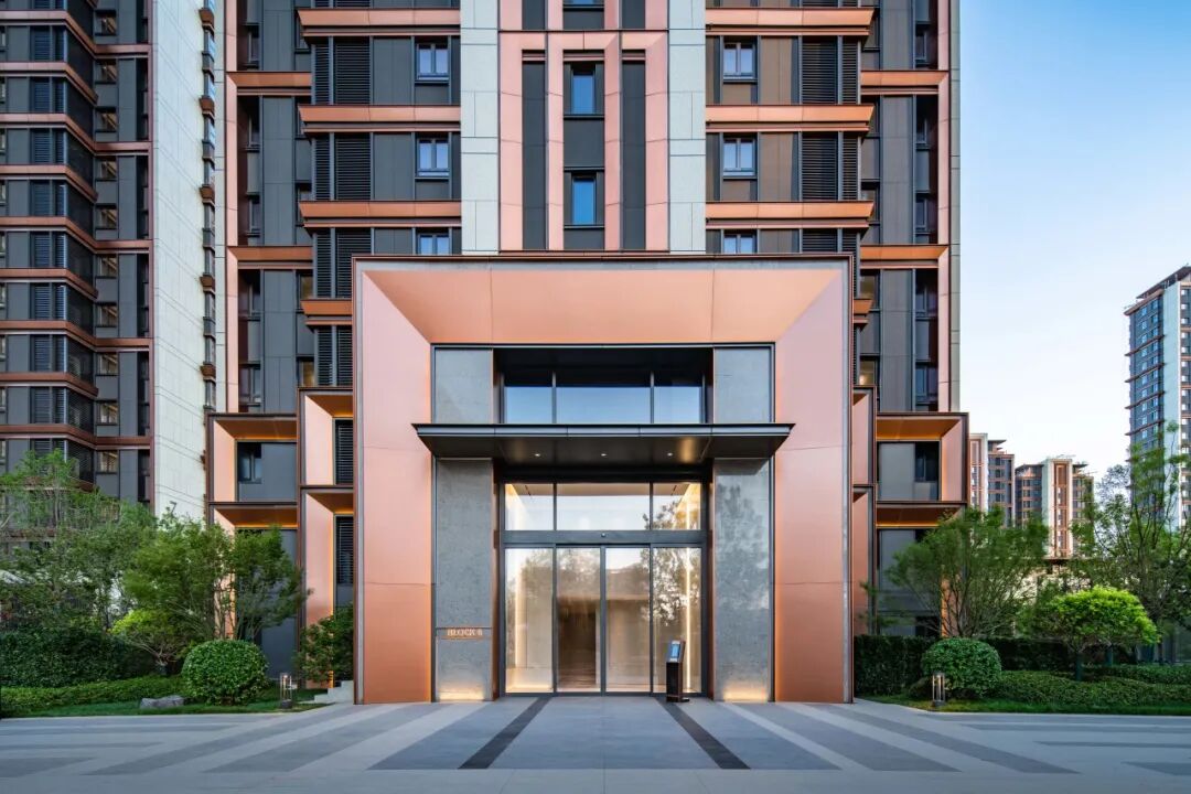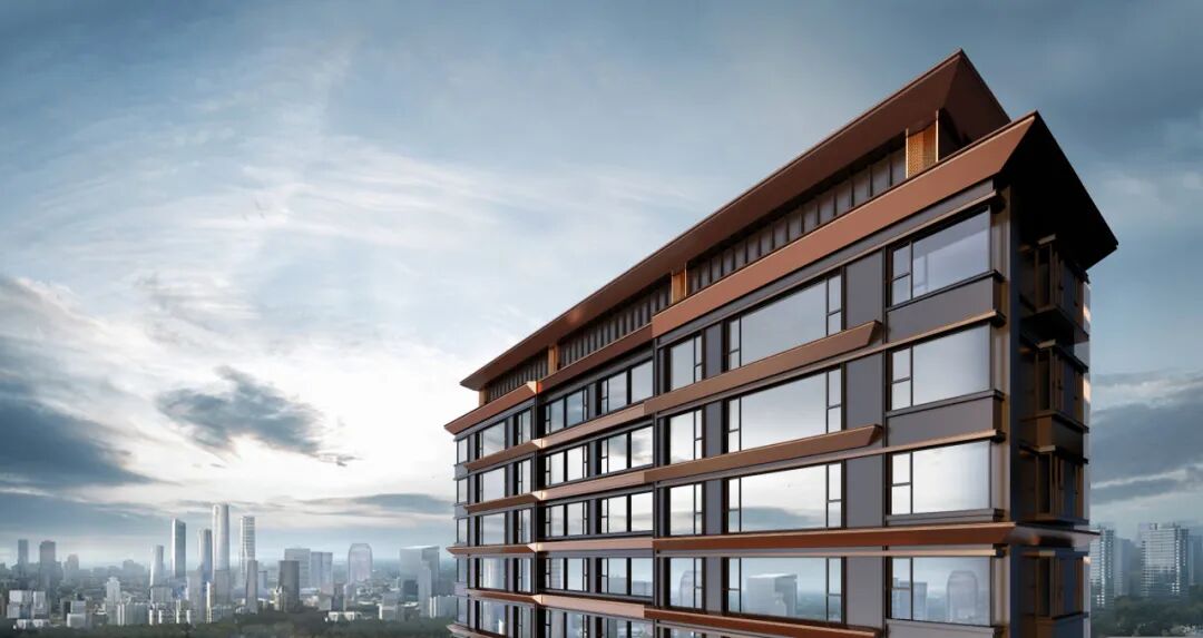 建筑色彩的选择上,提取传统建筑色彩,打造沉着内敛,经得起时间沉淀的立面肌理。仿铜铝板+浅灰色铝线条、仿铜色线条为立面增加一丝温度,营造温馨、浪漫的生活氛围。
