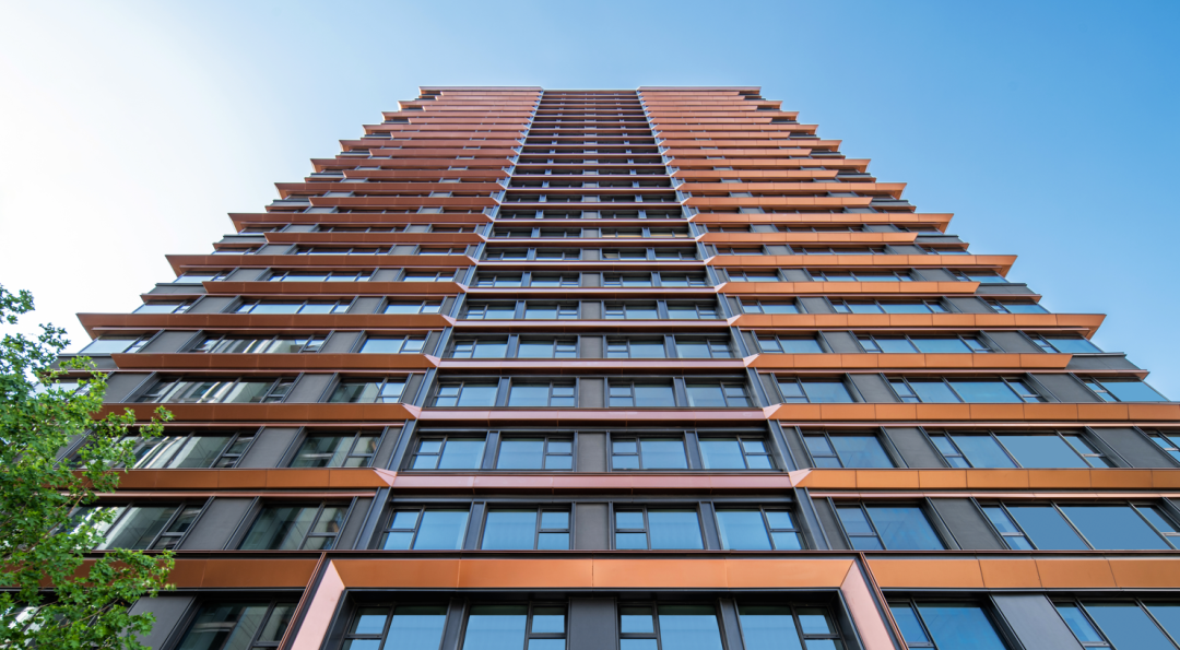 建筑整体采用流畅的一体式铝板和幕墙工艺,灰色型材及窗框收边使建筑于细节处体现力量感;通过色彩渲染和细节刻画,使立面既具有公共建筑前卫精致的特色,又不失住宅建筑温暖宜居的本质。