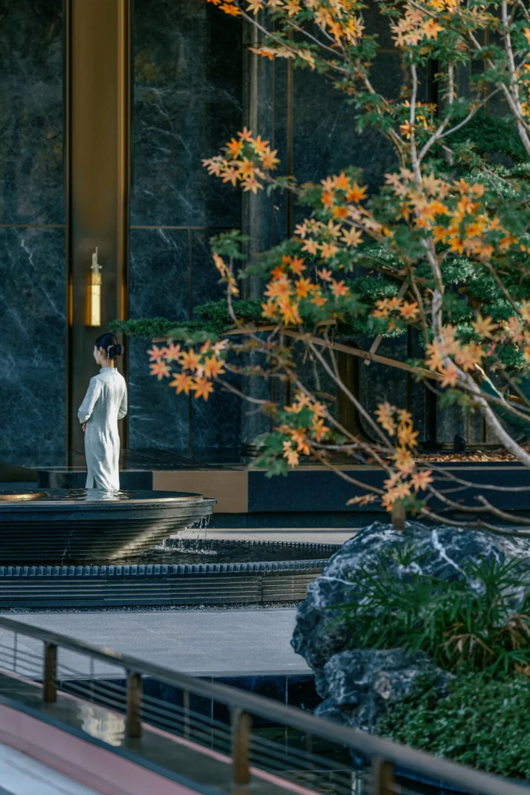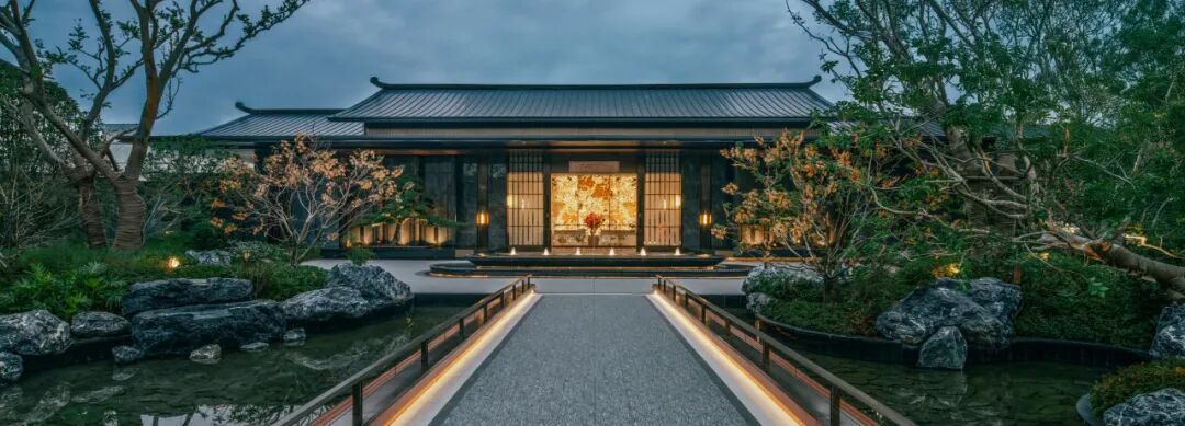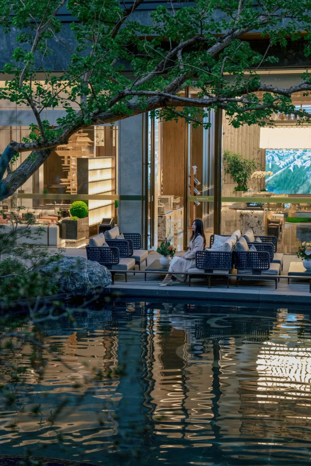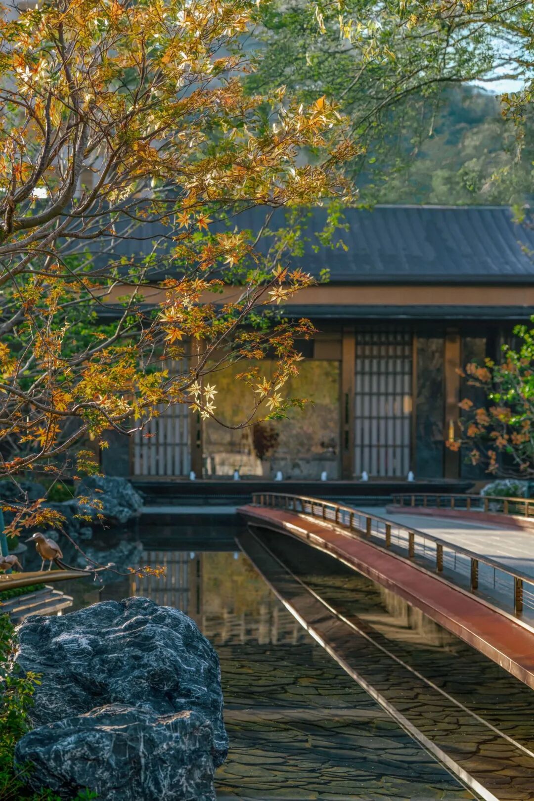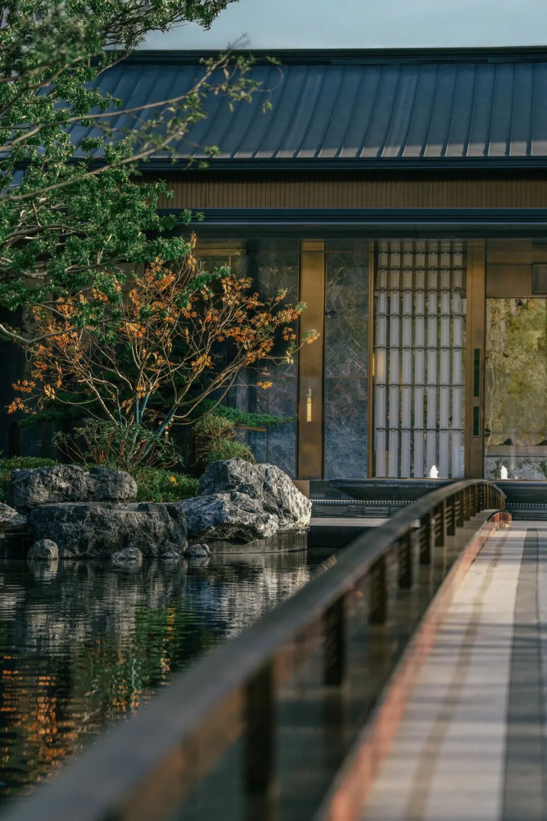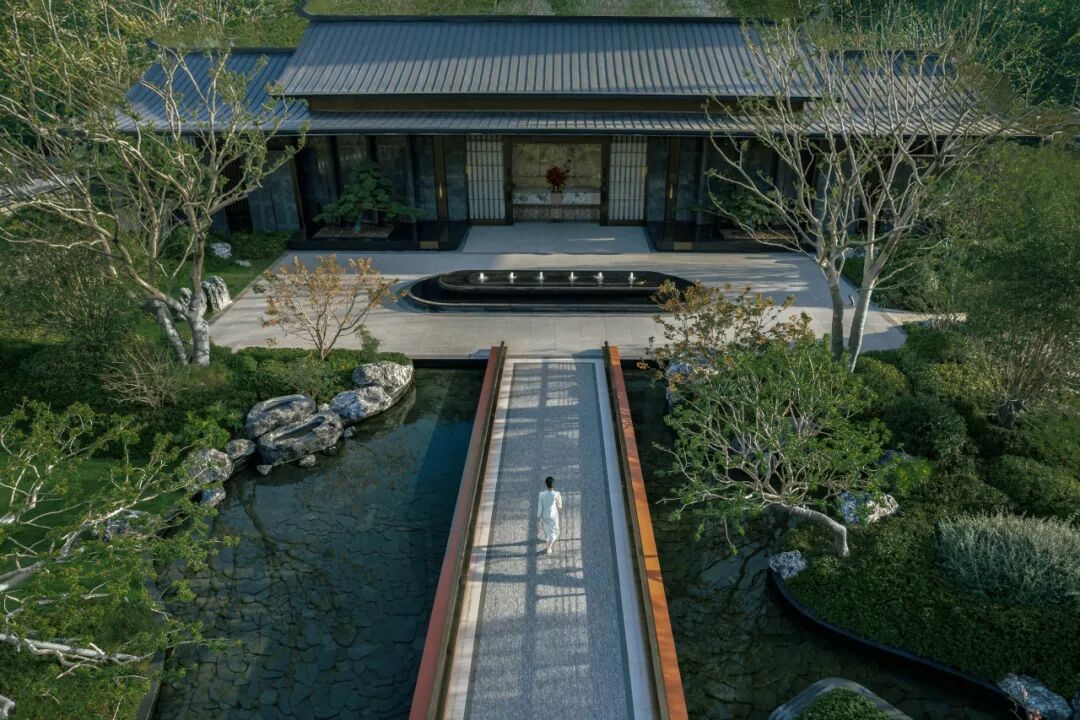 门为礼,水为乐,小桥两侧绿植传达着山峦起伏的韵律,一舟轻摇,一人独坐,池水悠悠,此间意境,宛若画卷中的风韵。