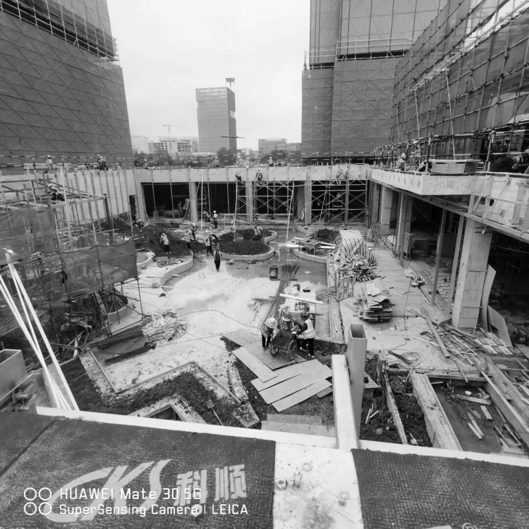 施工期间,武汉正值夏季高温炙热,常常达到35℃以上,地表温度更是高达40℃以上。面对夏季持续高温预警、气候干旱,绿化全过程反季节施工,项目团队严控苗木品类,通过选用容器苗、砖围苗、假植苗等各类成熟苗木,移栽过程对树穴、苗木土球、苗木根系进行精细化处理,栽种后通过抑制植物蒸腾,辅助树木吸取养分等措施,确保绿化即种即成景。特别是骨架乔木选型上,通过多角度现场感受空间,和各方多次沟通,最终选定精品且合适场地气质的乔木,为项目实景呈现良好效果提供了有效保障。