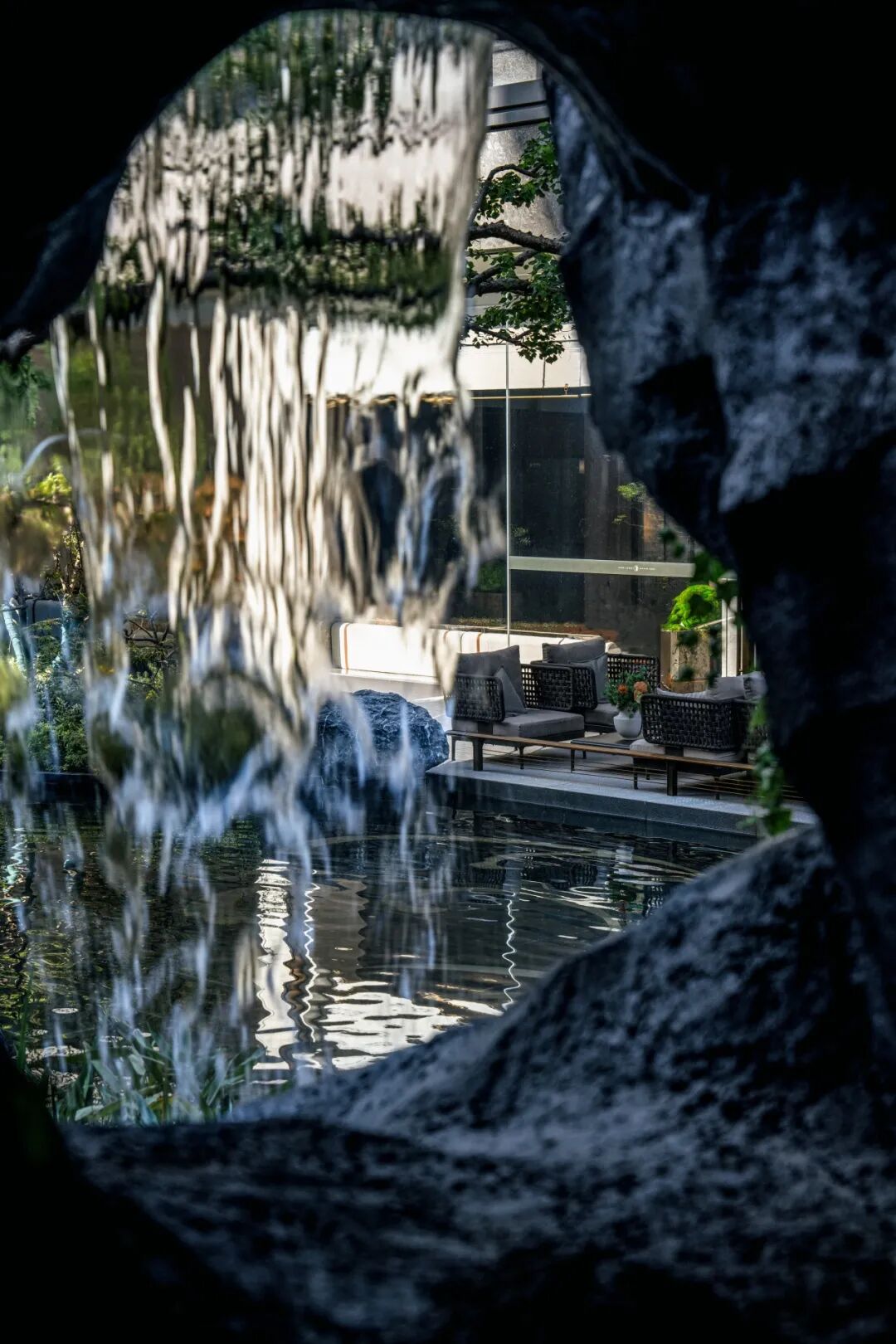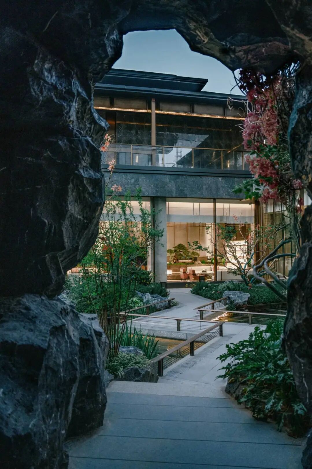 再现陶翁寻觅桃源的场景,从入口空间逐级而下,我们在下沉庭院为居者呈现一处隐于城市之间的山谷秘境。