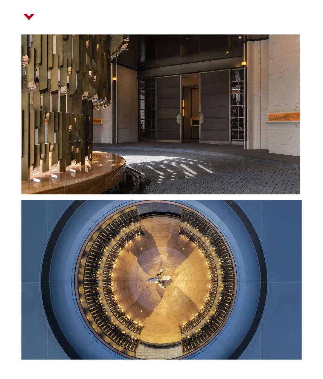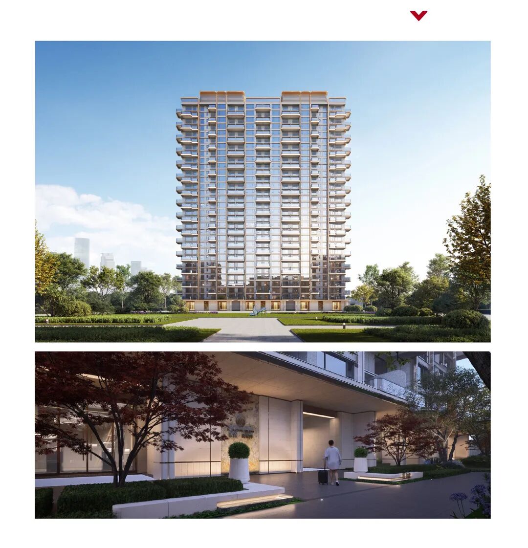 二进院约26米无柱连廊凌空延展,以创新姿态重塑空间美学;两侧迎宾水景打造归家仪式感,结合雾森系统调节局部小气候。
