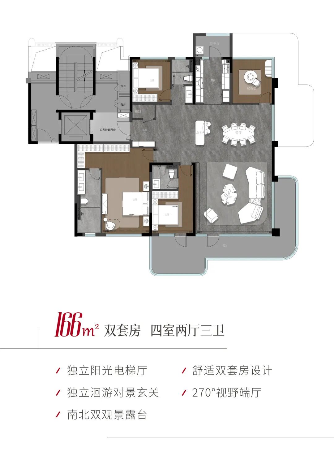 166洋房户型采用双面落地系统门窗设计,270°环幕视野打破传统户型边界;奇偶层错层南北双露台局部放大空间处理,预留丰富生活场景。