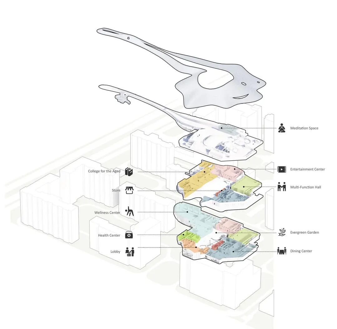 活动中心包括一个娱乐设施、一个食堂、一个图书馆和一个专为老年人设计的大学,提供丰富的功能和参与机会,以满足老年人的不同需求。每个功能块都围绕中央战略中庭花园精心组织,营造自然、轻松、开放的空间氛围。通过方便的移动,布局赋予老年人深思熟虑和实用的空间体验。室内走廊连接建筑的所有功能块,确保无缝导航,同时为老年居民提供方便的访问和愉快的体验。精心设计的无障碍方式延伸到垂直交通,使老年人可以毫不费力地进入每个区域。