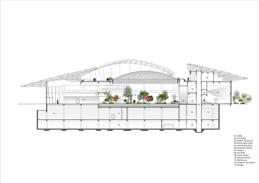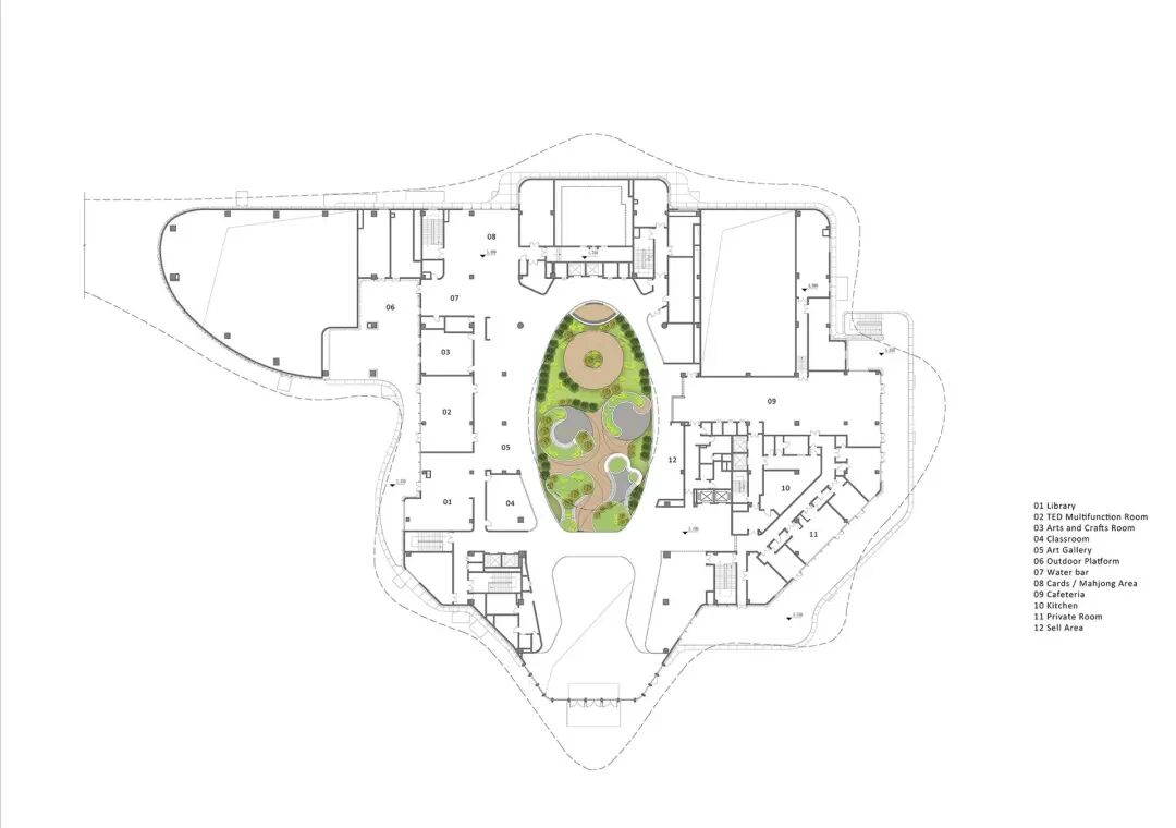 该建筑采用轻质聚四氟乙烯作为其弯曲的膜屋顶,就像一朵悬浮在地面上的云,证明了设计的轻盈性。高耸的两层玻璃幕墙标志着建筑的入口,将自然环境引入室内,并以充足的自然光线装饰。垂直分割的金属幕墙进一步丰富了墙体的视觉吸引力。活动中心拥有新颖的空间体验,加强了老年居民与自然之间的联系,为他们从事活动创造了额外的空间,满足了他们的精神需求。建筑的多样化功能在其布局中很明显,包括地上两层(部分为三层)和地下两层,总面积为11,800平方米。它于2023年秋季投入运营。