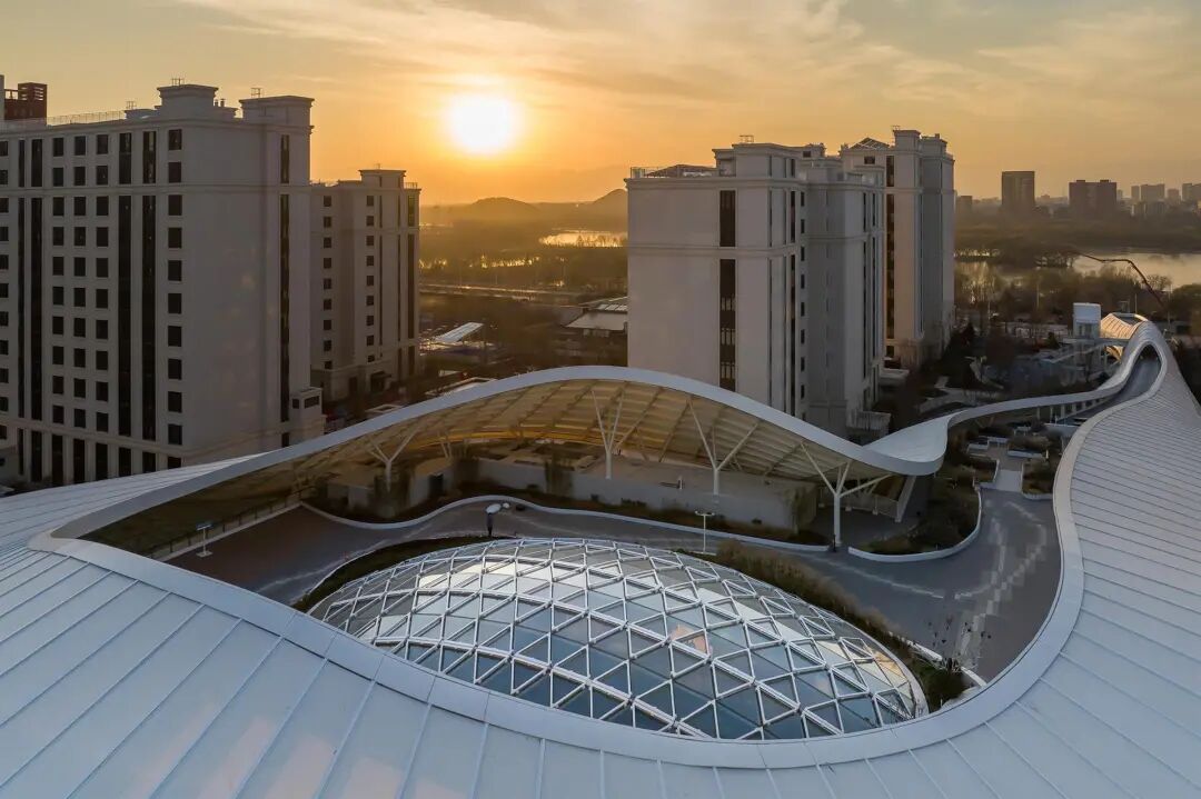 The building embodies lightweight PTFE as its curved membrane roof, which resembles a cloud hovering above the ground, serving as a testament to the lightness of the design. A two-story glass curtain wall standing high upright marks the entrance to the building, drawing the natural environment into the interior and adorning it with abundant natural light. The visual appeal of the wall is further enriched by a vertically divided metal curtain wall. The activity center boasts a novel spatial experience that strengthens the connection between elderly residents and nature, creating extra space for them to engage in activities and satiate their spiritual requirements. The building’s diverse functionality is evident in its layout, comprising two floors above ground (partially three floors) and two floors below ground, totaling an area of 11,800 m². It was put into operation in the autumn of 2023.