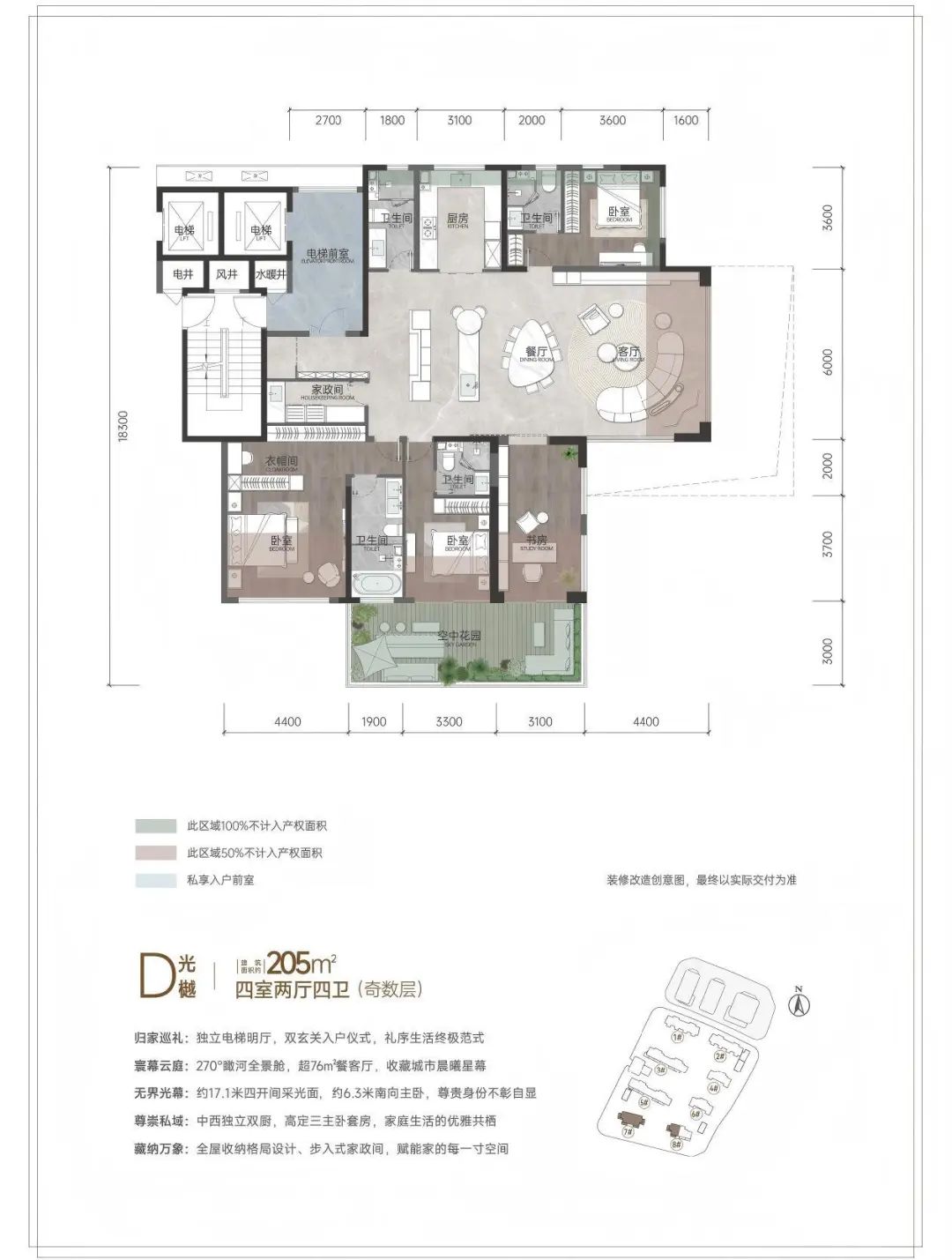 多元灵动的户型设计、区域独享800库超大储物间,打造实际使用率103%起优居生活户型。电梯私家入户,私享电梯外入户收纳空间,顶/底跃超大挑高空间,随心定制收纳。