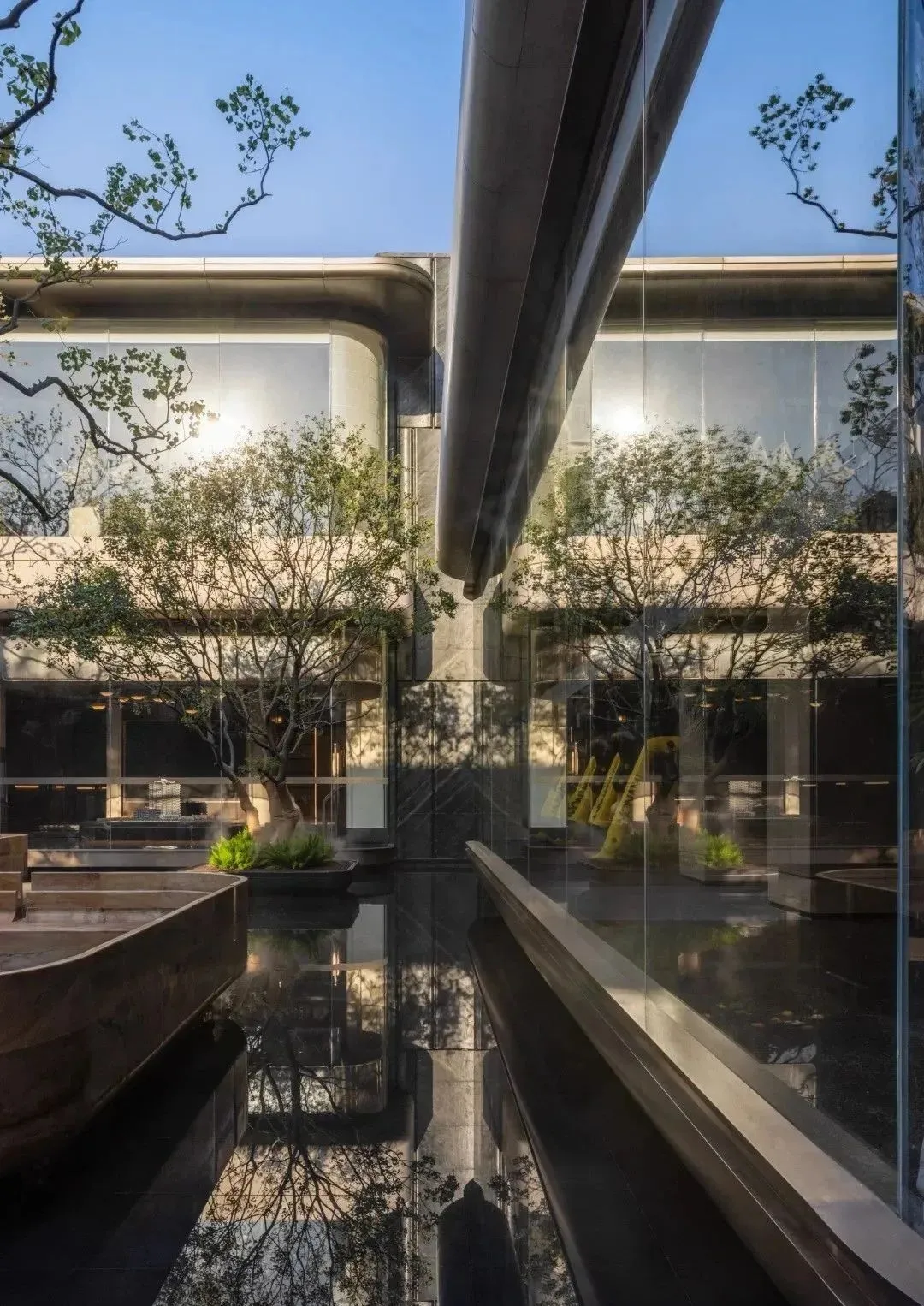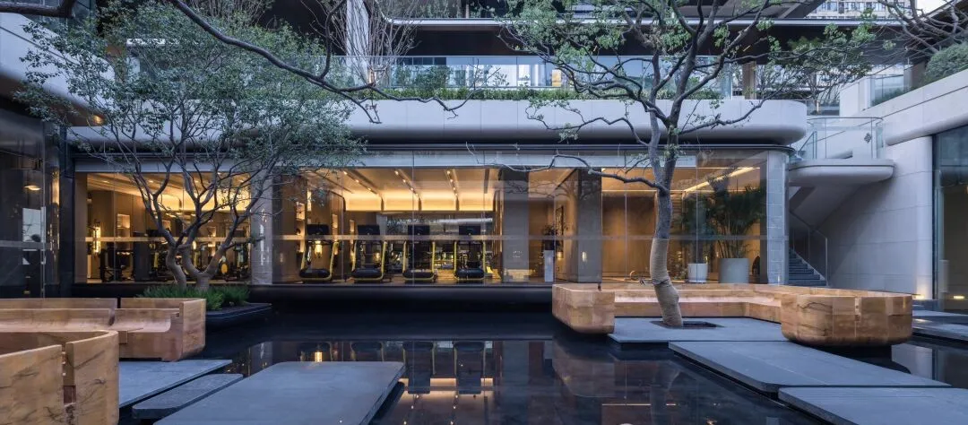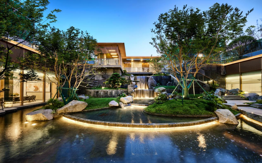 移步下沉庭院,叠瀑水景如脉络般串联起山、台、石、林、池,宛然一幅立体的水墨盆景跃然眼前。