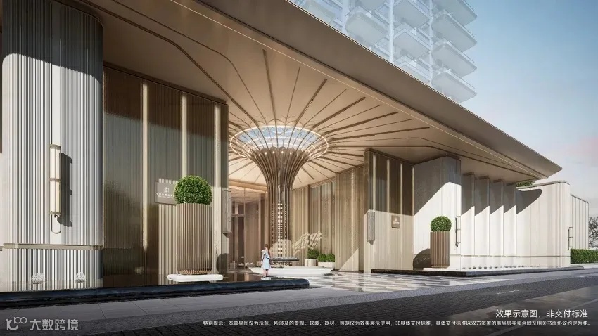 建筑立面以龙山黑陶器型曲线,结合现代建筑风格,打造顶部精致塔冠、微弧倒角设计,形成强烈视觉符号;以沉香米黄主色调,搭配香槟金铝板,呈现精致典雅的美学风格,致敬中原文明。