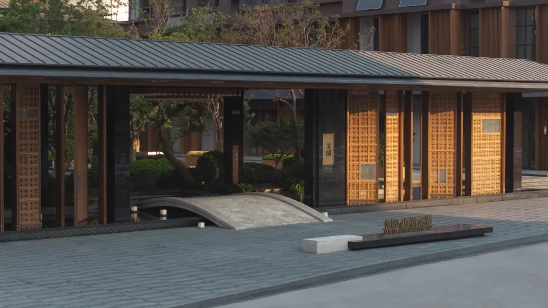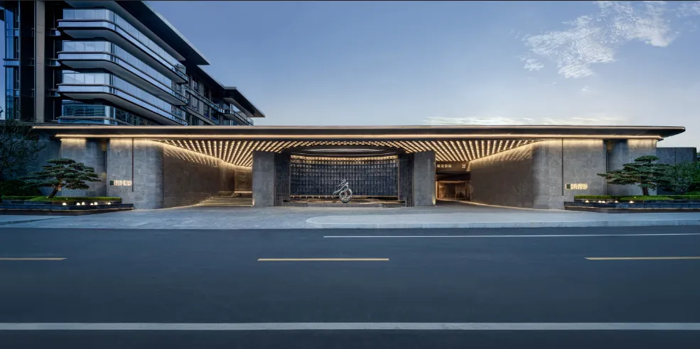 项目大门承古建新,采取双坡弧形屋顶,融入诸多传统建筑元素,以当代手法呈现传统文化之美。整个空间布局、功能性和美观性完美融合,兼具文化、艺术美学、品质和品味的设计效果。