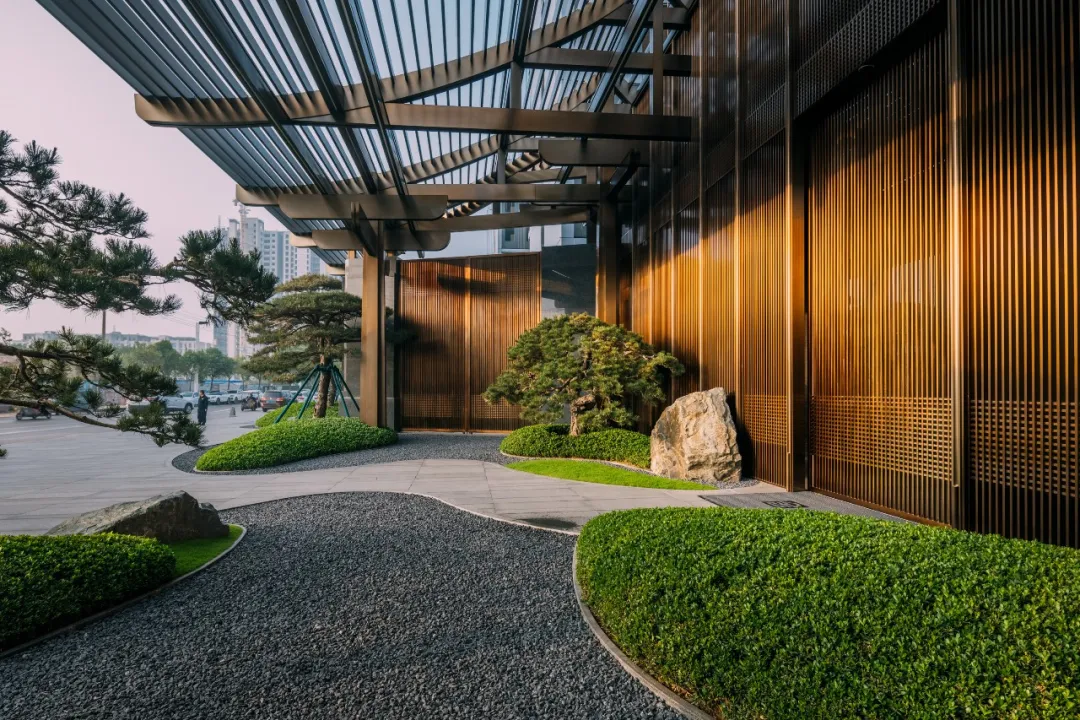 竹苑位于开放式的城市街道,为了重构空间的氛围,大门打破了普通入口的“单片”形象,以不一样的、非传统的“立体”架构,创造人可以参与的,可以体验阴、晴、风、雨等自然因素的“山水的容器”。