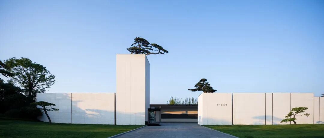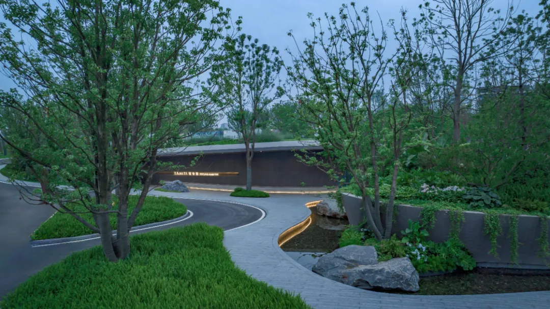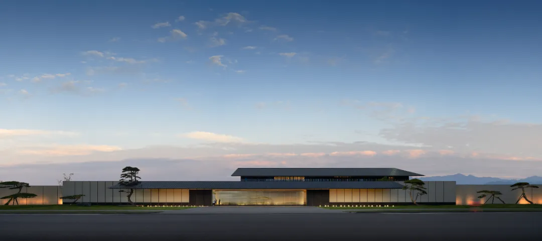 项目的入口设计深刻地体现了门头融入自然,与自然和谐共生的理念。项目位于成都黄龙溪的溪谷之间,前场是一个空旷舒朗的大草坡,一面开阔平静的湖水,湖水之下溪水潺潺流淌。设计充分利用这一自然生态优势,自然而然、顺势而为,通过“借山、借水、借势”的手法,将建筑与景观融为一体,创造出一个“别有天地谷上居行”静谧隐逸的入口空间,引导人探索并享受这片自然与艺术交织的天地。