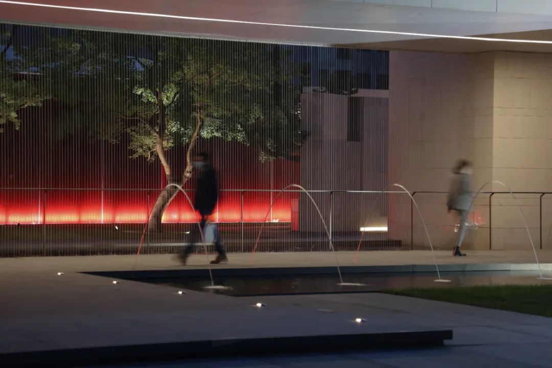 随着时间的变化,墙面与天井的光照通过涌泉水景的反射,也会出现各种戏剧化效果。静待夏夜晴空时,月和疏影上东墙。