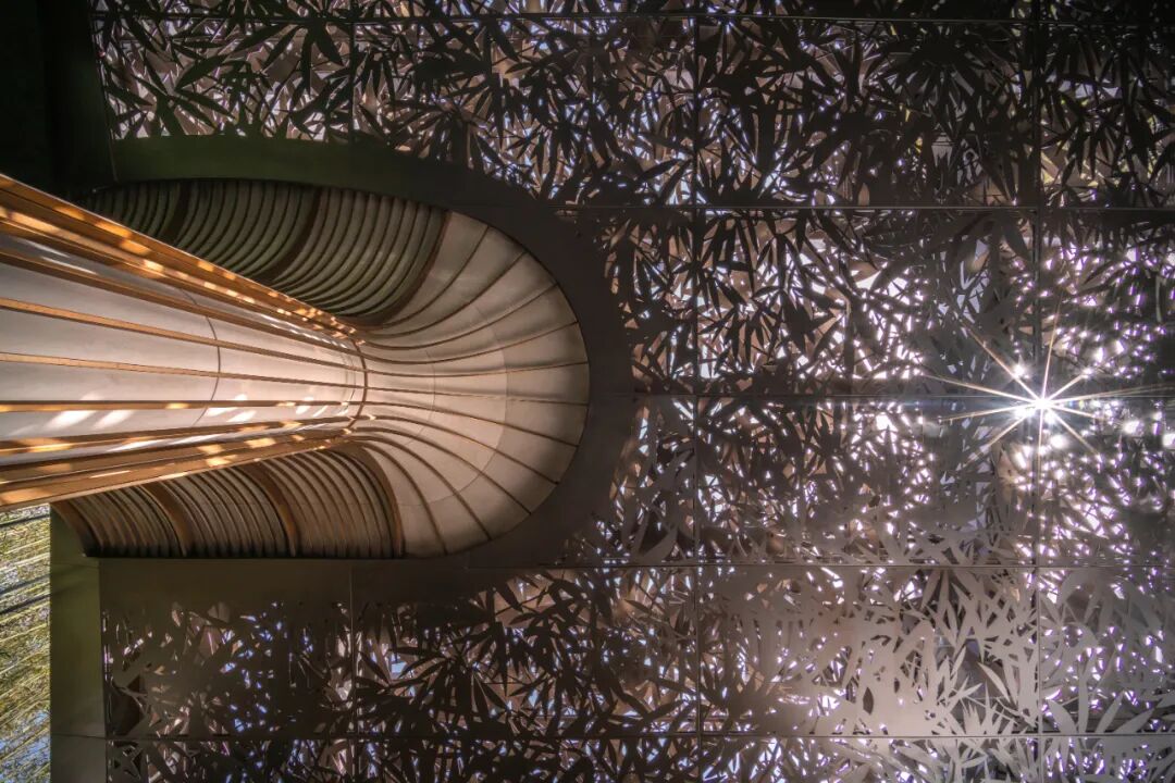 柳编景墙方案,汲取传统柳编技艺精髓,经过反复推敲,最终确定采用最具代表性的编织手法。通过与工厂的多次确认、送样,最终使用36000根金属条,完成了1500个柳编模块,完美还原方案设计效果。这不仅是对传统技艺的传承和创新,更体现了工匠精神中的追求卓越和对细节的执着,同时以新形式为人们呈现传统工艺之美。