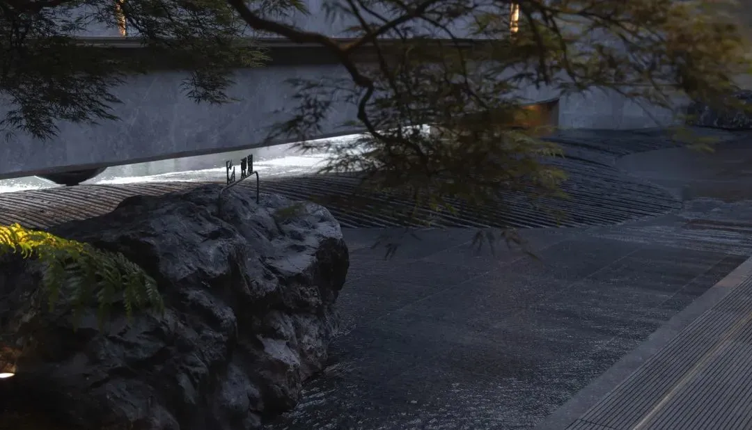 归家水景以中国黑石材竖向拉槽工艺,营造千里江山图的起伏节奏,演绎入海观潮的水景效果。水院对景精选有百年树龄的羽毛枫作为点景树,与沉稳的黑石、灵动细致的流水融为一体,为空间增添了庄重与雅致的人文气韵,赋予整个水院一种宁静而高贵的氛围。