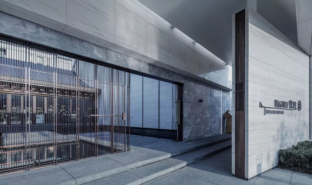 门庭屋顶汲取中国古建筑的精髓,以现代手法加以诠释,整体运用飞檐翼角、榫卯、千攒斗拱等诸多元素,呈现出一股独具魅力的东方气韵。整个建筑构造精巧、造型美观,一眼望去,高大气派,充满了书卷气息。透明的屋顶和镂空的木制隔墙,让光线自然地流泻进廊内,使内廊空间不显得沉闷,呈现出一种光影交叠的通透与和谐。