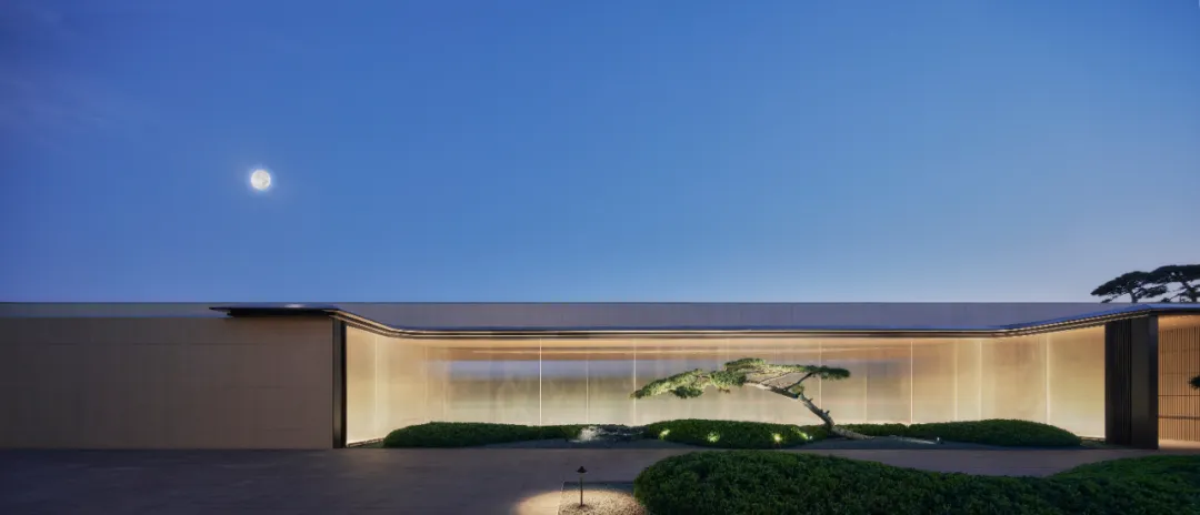 入口空间通过线性分隔与空间穿插重组,形成虚实结合的前厅以及自然雅致的门庭景观,并考虑空间均好性,设置等候区及最佳赏景点。视线在入口处聚焦,松王的乍见之欢,带来尺度下的力量感,而在长虹玻璃的隐约下,背后斜飘松的形态,同样幻化出写意的美感。