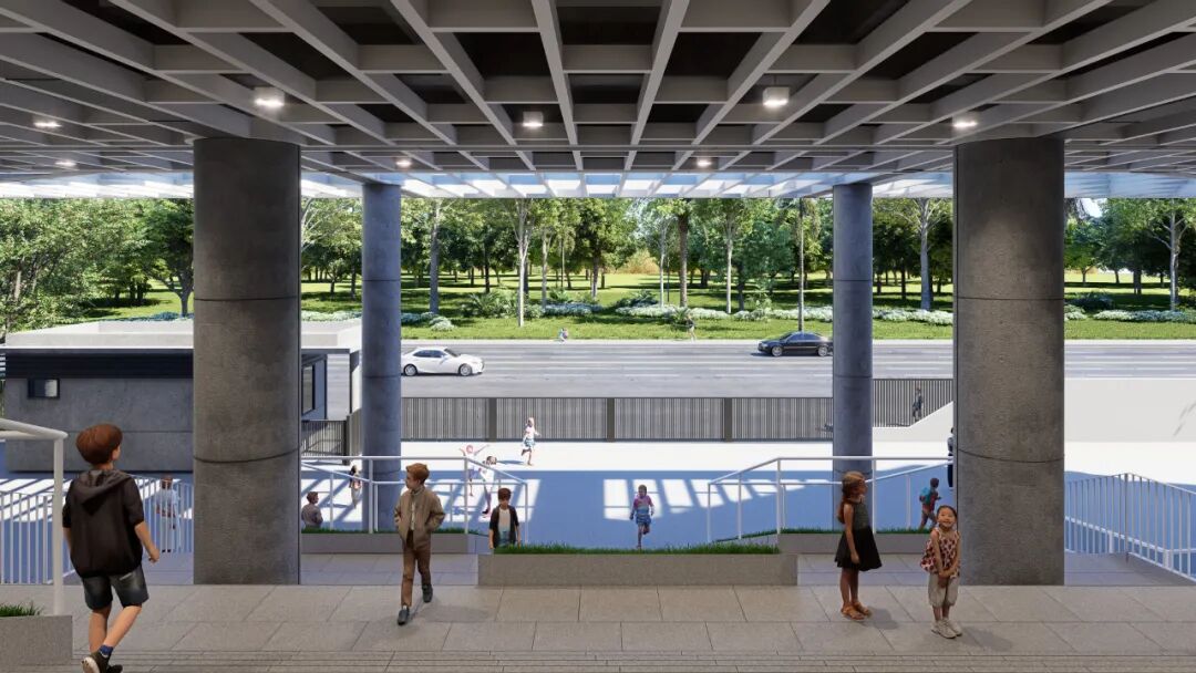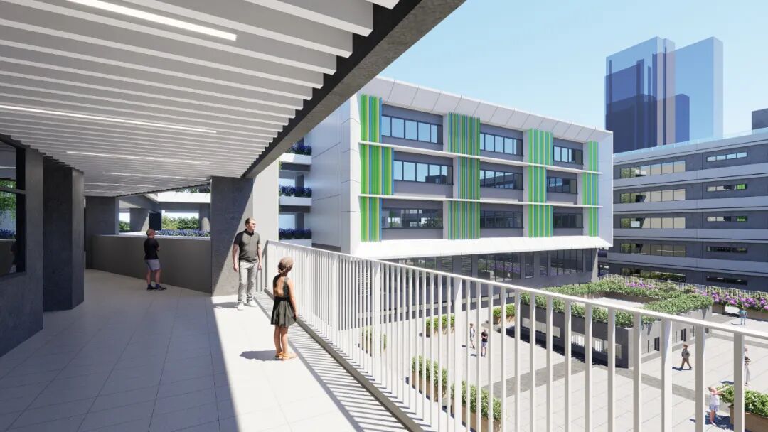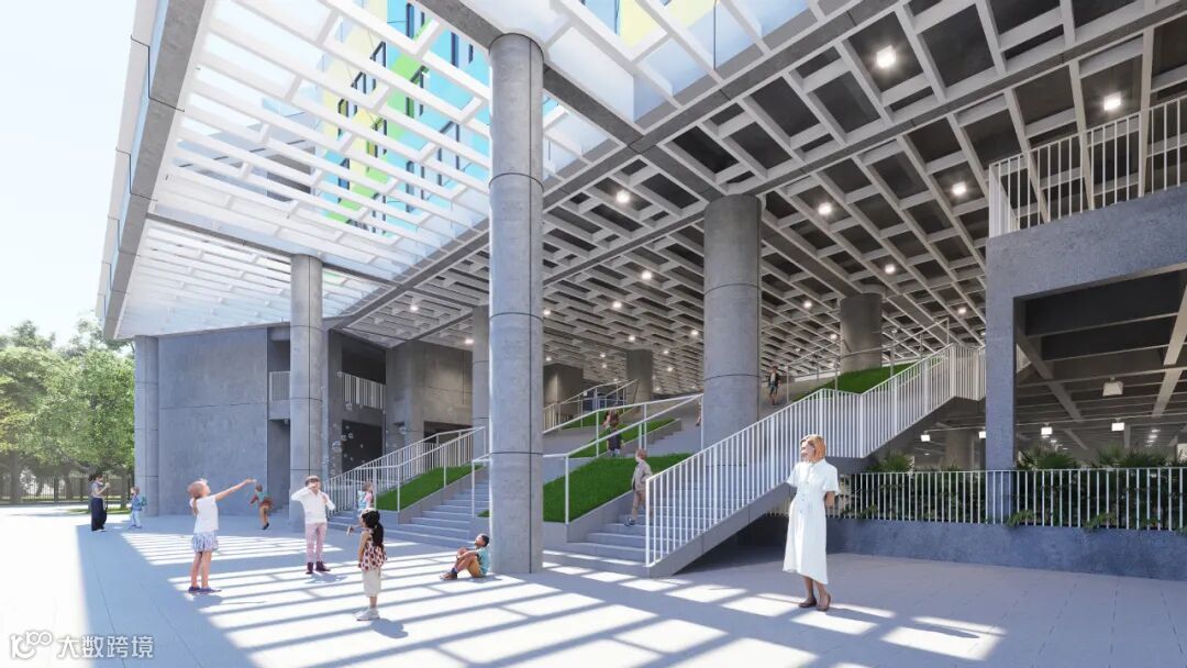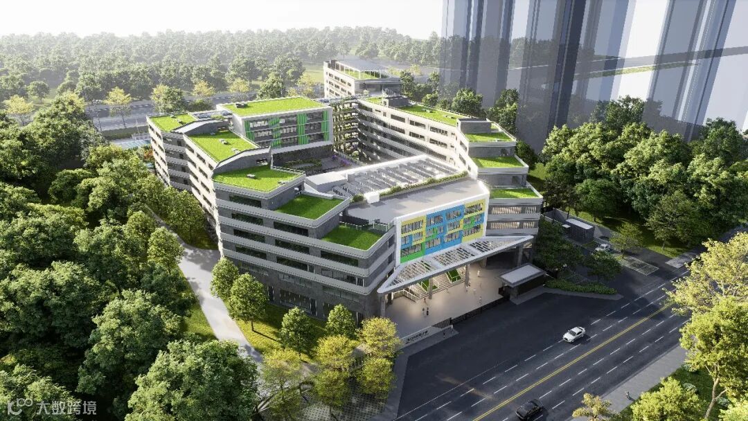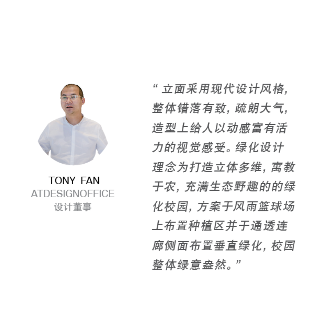 由于建筑密度大,面对城市道路建筑设计采用退台形式,减少视觉压迫感,形成良好城市界面。退台屋顶设置屋顶花园,让建筑显得郁郁葱葱,为城市的景观做出贡献,这些退台也为楼上的师生提供的课间休息的空间。