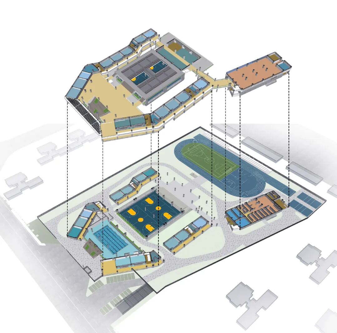 东面入口临马路做了港湾式后退,在北侧设置了停车场。从大门进入校园后通过大台阶直达二层架空层。在紧凑的用地通过立体的动线良好地组织了人车分流,又兼顾空间体验和具有仪式感的入口设计。360个座位的报告厅布置在入口综合楼的三层,更是增加了这个建筑的立体布局。
