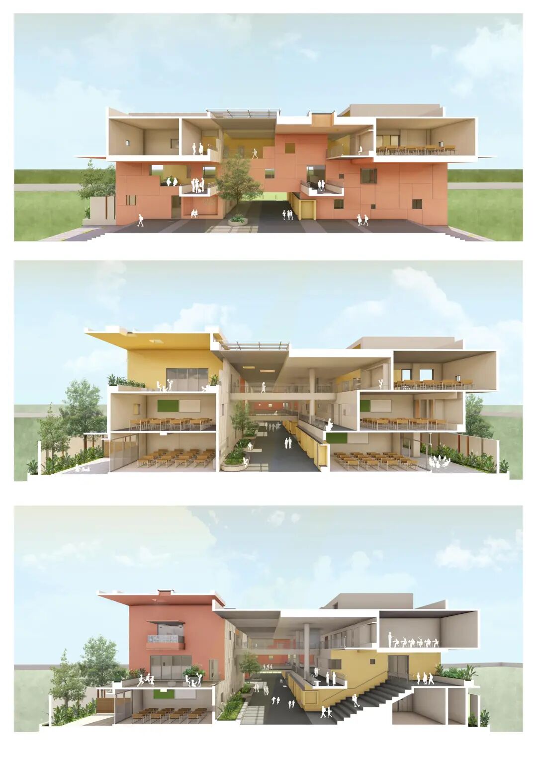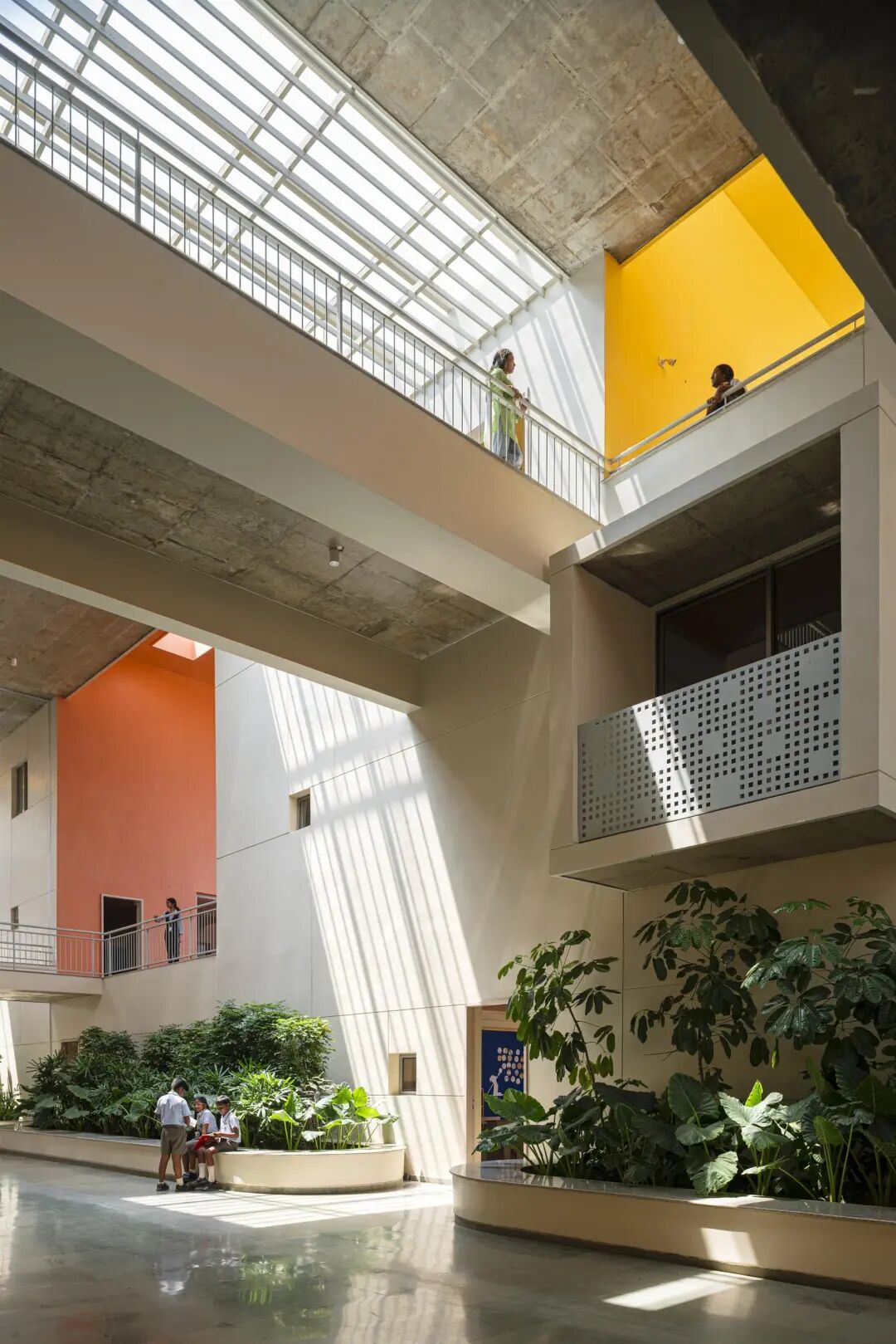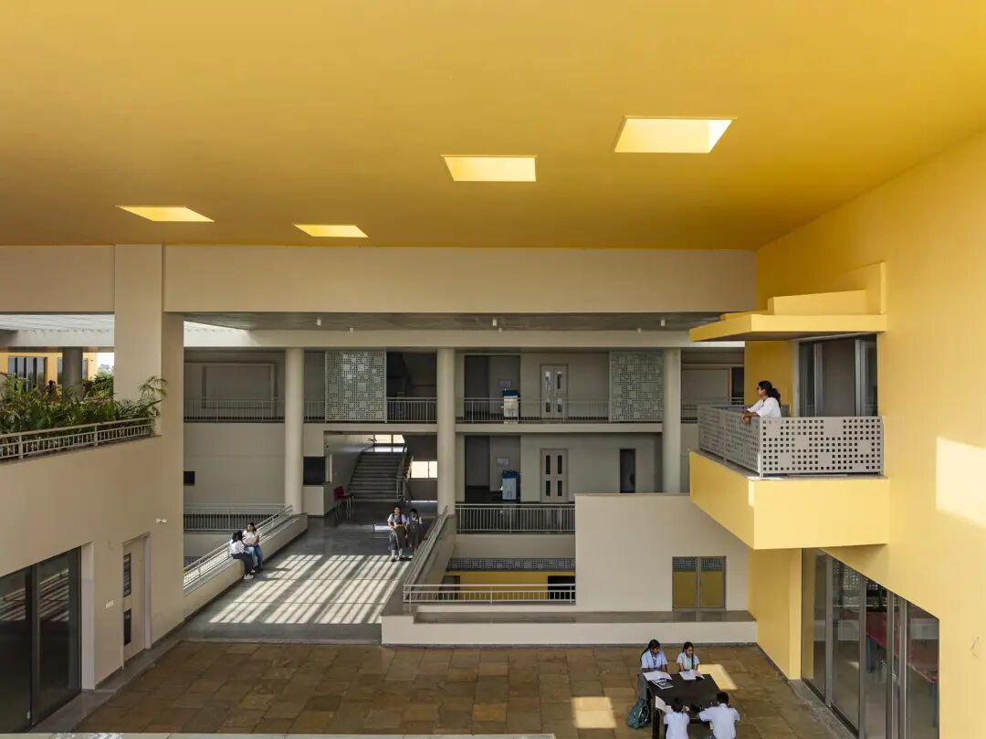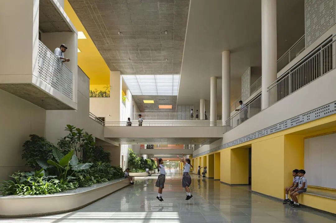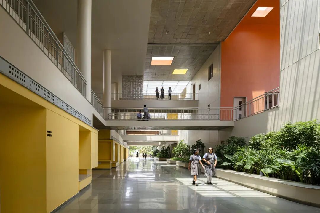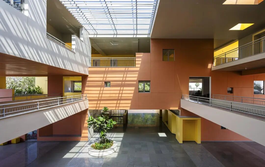 彩虹国际学校——作为现有校园的补充,这座三层楼高的建筑横跨东西,长边面向南北,最大限度地减少了热量的增加。中央脊柱,一个巨大的三层体量,划分了学校的南北翼,桥梁跨越,在多个层面上交错。在这个体量中,雨水从顶部通过天窗照射到充满热带绿色植物的大型种植园上,这些植物遍布整个学校。南翼本身是交错的,以保护较低的楼层不受南方高太阳的照射。