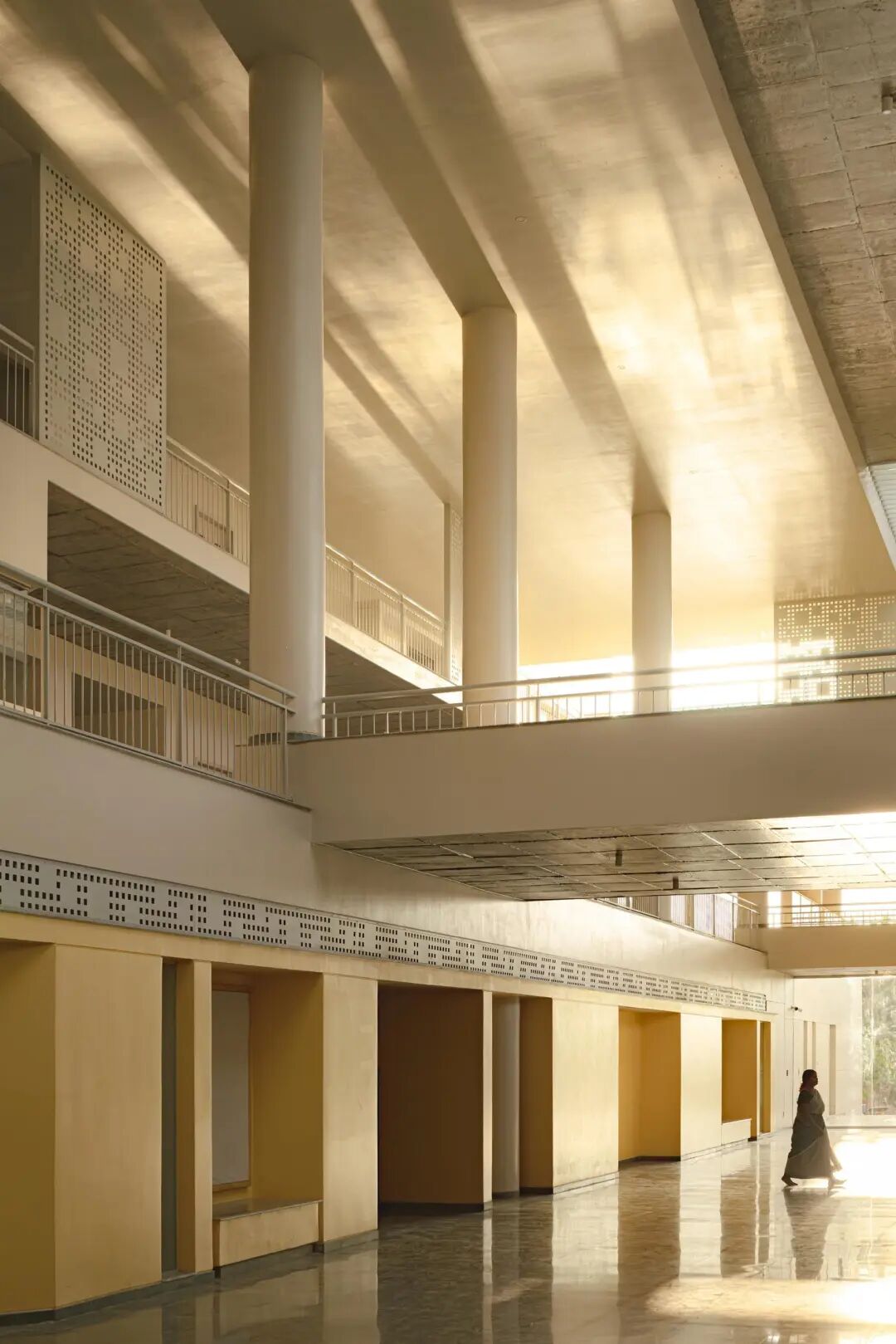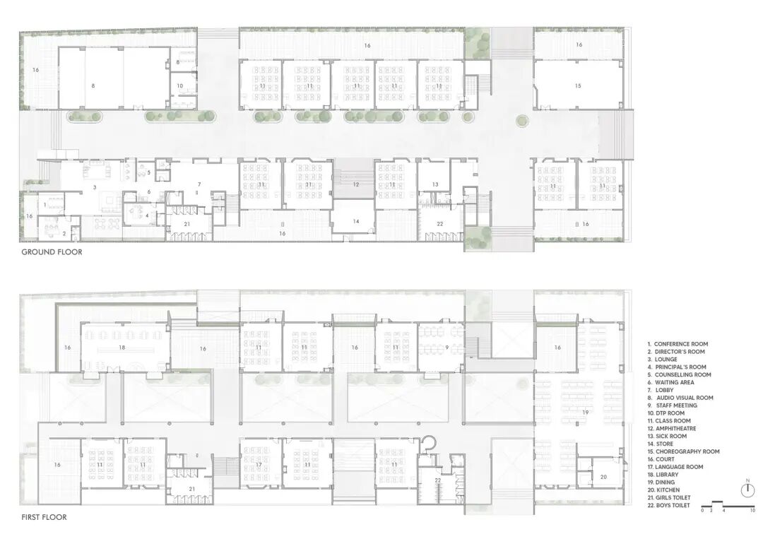 教室和庭院:一层的教室面向阴暗的南北庭院。较高楼层的教室向东或向西开放,共享大的双层高庭院。这些庭院试图通过消除墙壁,使教室更接近古鲁古鲁模式,从而缓解典型的四墙教室所带来的狭窄感觉。为了充分参与建构主义学习,学生需要在讲座、小组学习、演讲、讨论和个人作业时间之间进行转换。