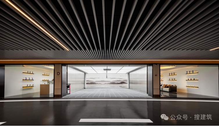 比如,苏州象屿天悦东方,车库入口处超大面积的星空穹顶,搭配发光LOGO,仪式感拉满。顶部和两侧下方均有流线型发光灯带,暖色流线灯与超跑曲线的碰撞,超具氛围感。