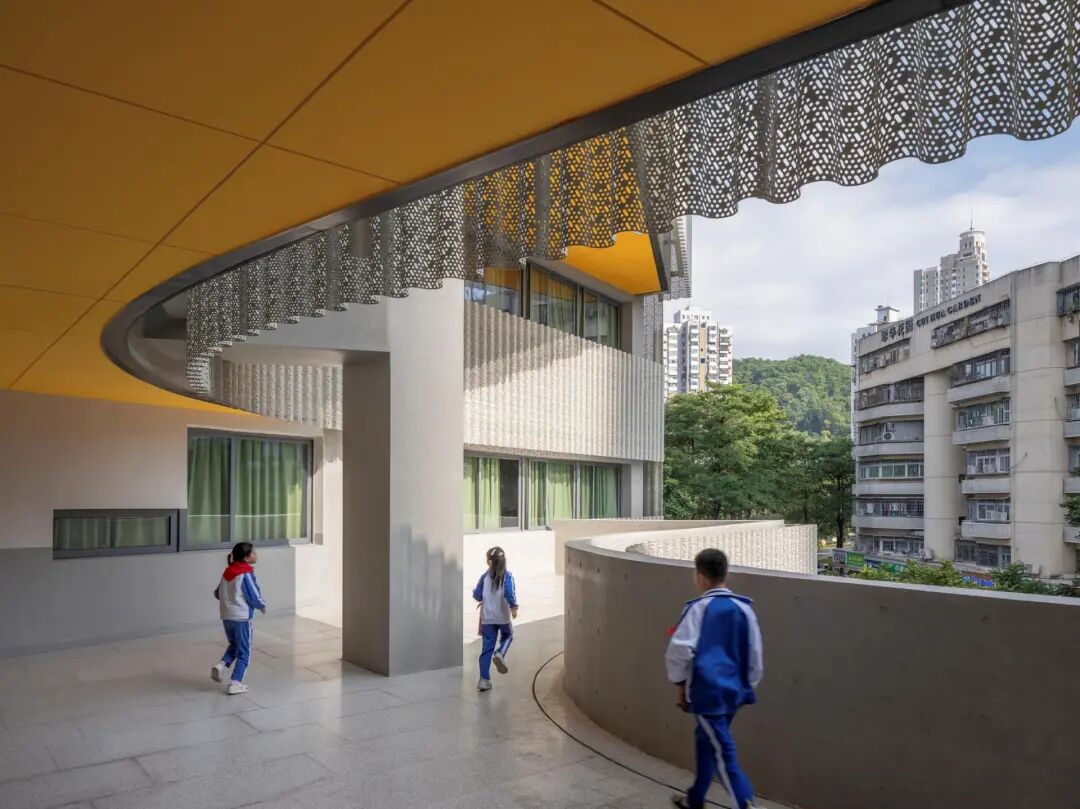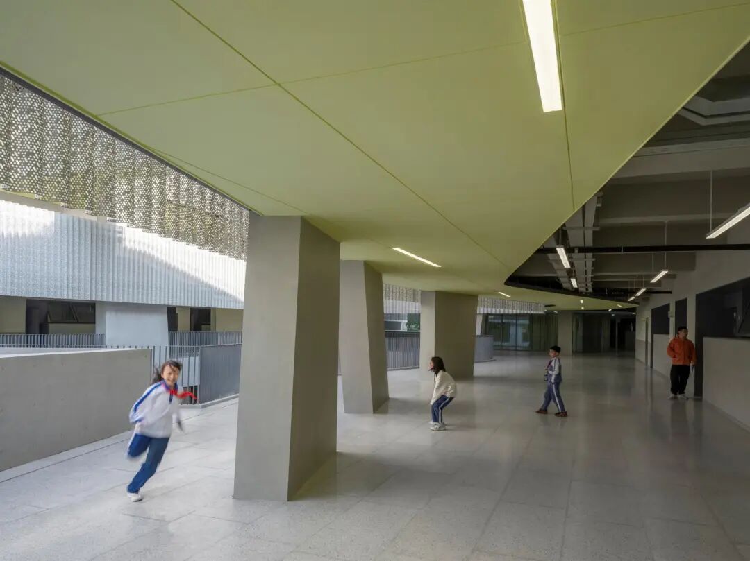 FORM AND LANDSCAPEThe design of the Cuizhu School evinces a deliberate strategy that spatially and compositionally links the landscape design and massing to the site and environs beyond. The terraced massing of the school steps down to the south to allow access to light and air, and to promote a congenial relationship to the open athletic spaces associated with the school. The voids in the massing create urban entry spaces on the northwest, and conceptually extend exterior open spaces to the south and west.
