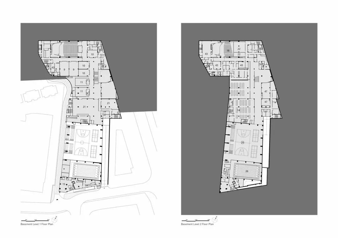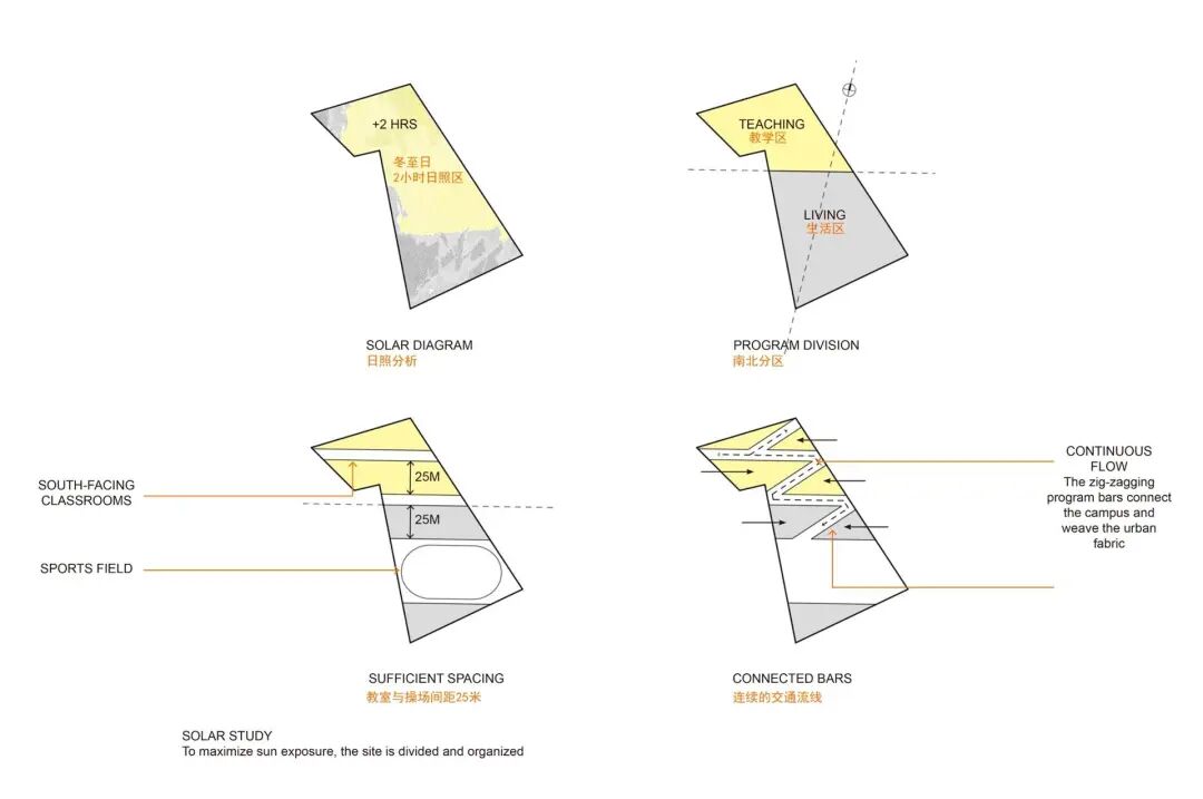 形式与景观翠竹学校的设计体现了一种深思熟虑的策略,即在空间和构图上将景观设计和体量与基地和周边环境联系起来。学校的梯田体量向南延伸,允许进入光线和空气,并促进与学校相关的开放运动空间的和谐关系。体量中的空隙在西北部创造了城市入口空间,并在概念上将外部开放空间延伸到南部和西部。